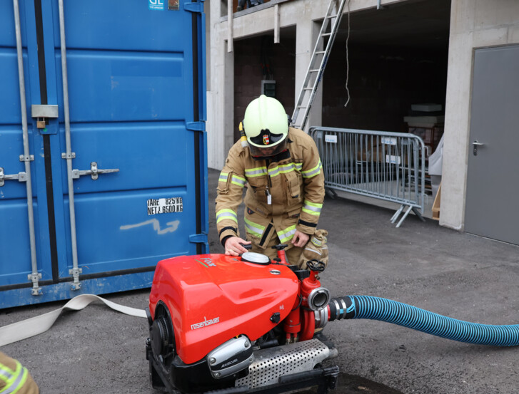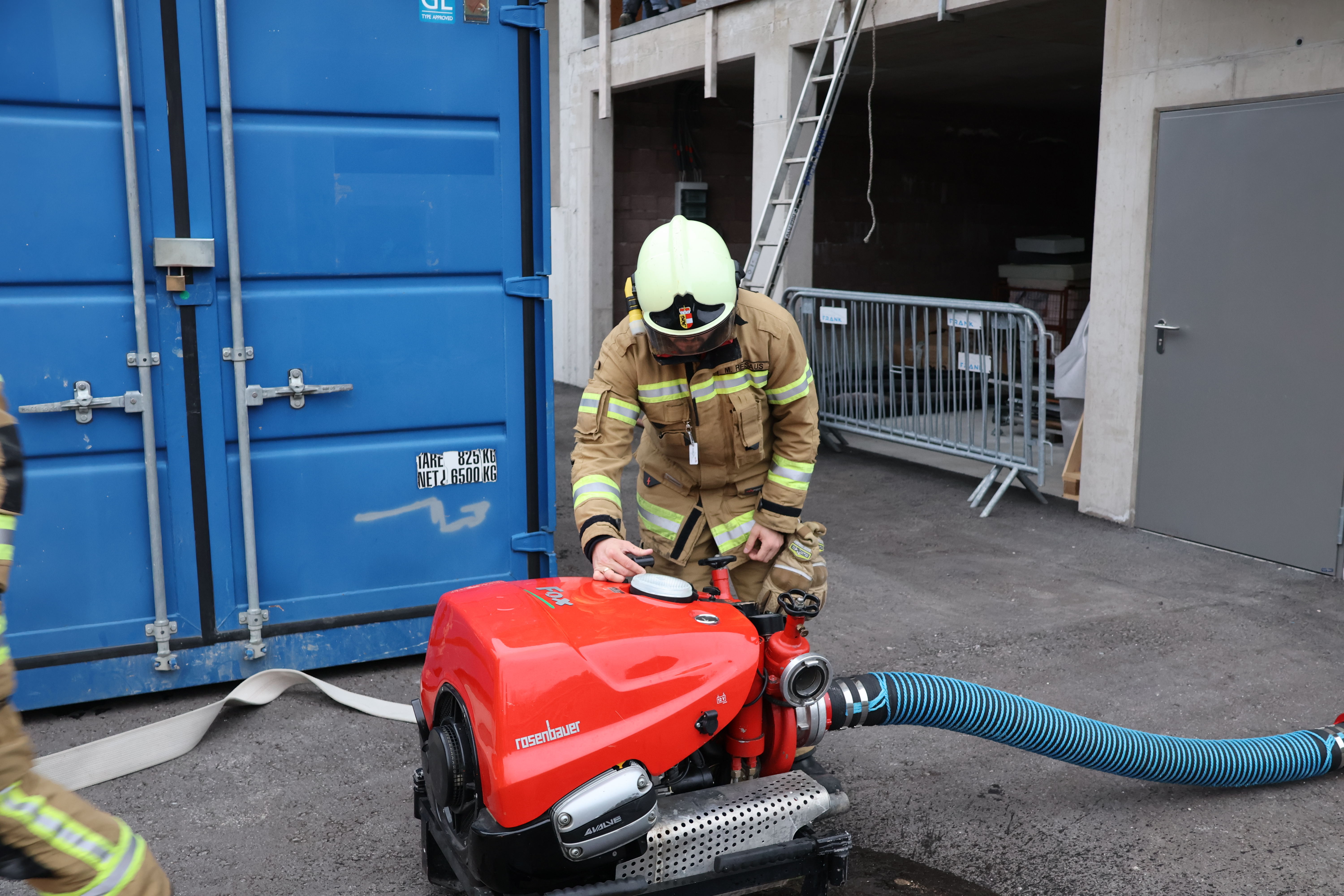 Parallel dazu stellte das Rüstlöschfahrzeug die Wasserversorgung für das Tanklöschfahrzeug 1 sicher. Dies erfolgte mittels Tragkraftspritze des Löschfahrzeuges über einen am Firmengelände gelegenen Löschwasserbehälter. Ein Atemschutztrupp des Rüstlöschfahrzeuges stand zudem als Reservetrupp bereit. Ergänzend wurde ein Außenangriff mit einem C-Hohlstrahlrohr durchgeführt, um die Leistungsfähigkeit der Wasserversorgung auch bei erhöhtem Wasserbedarf zu testen.