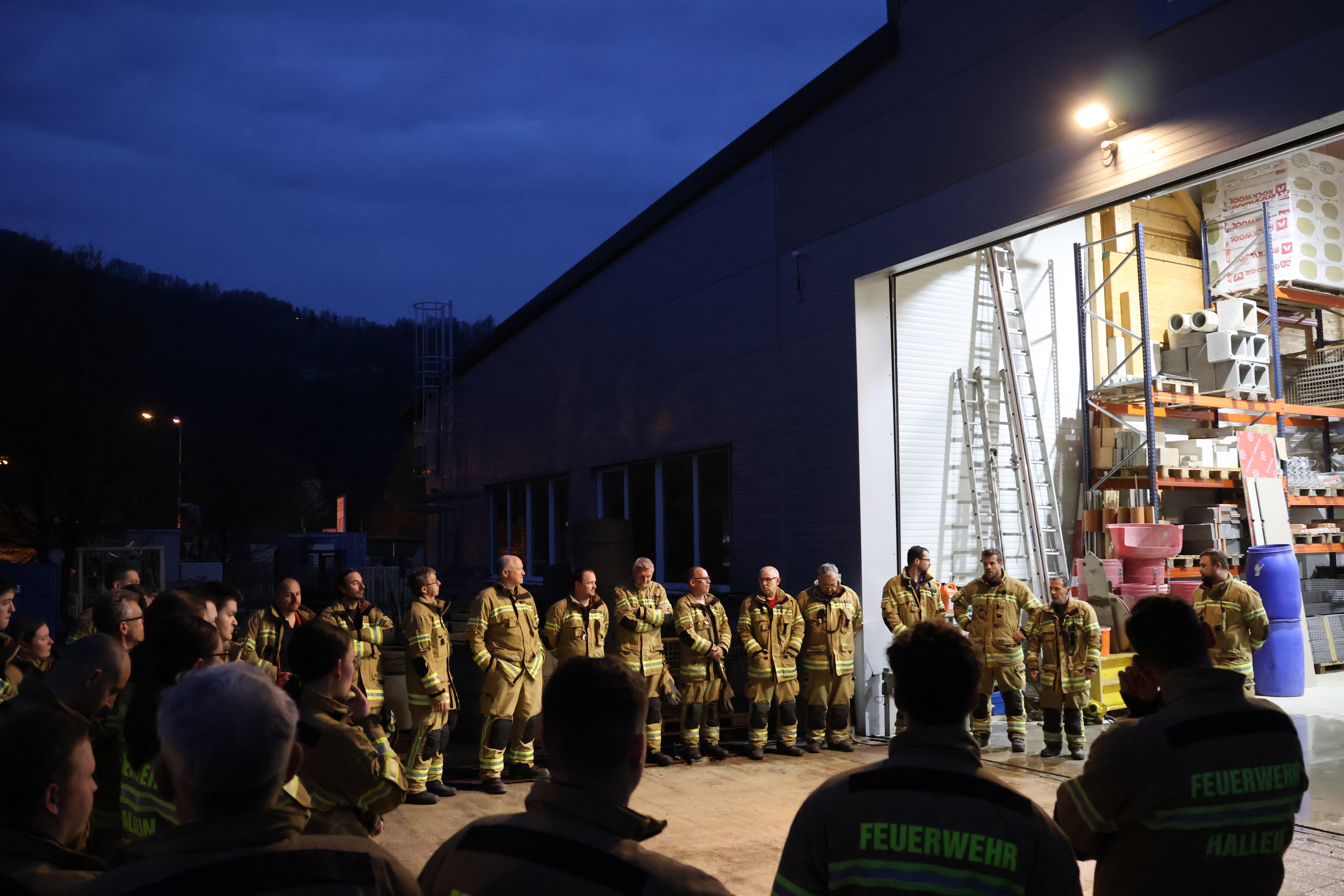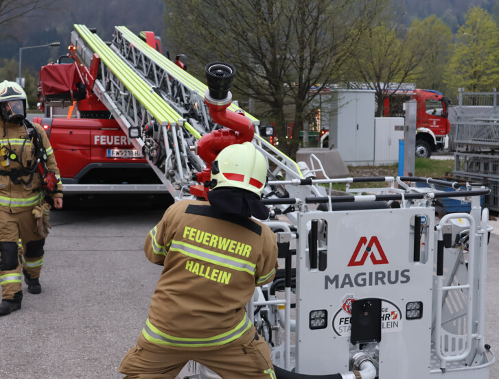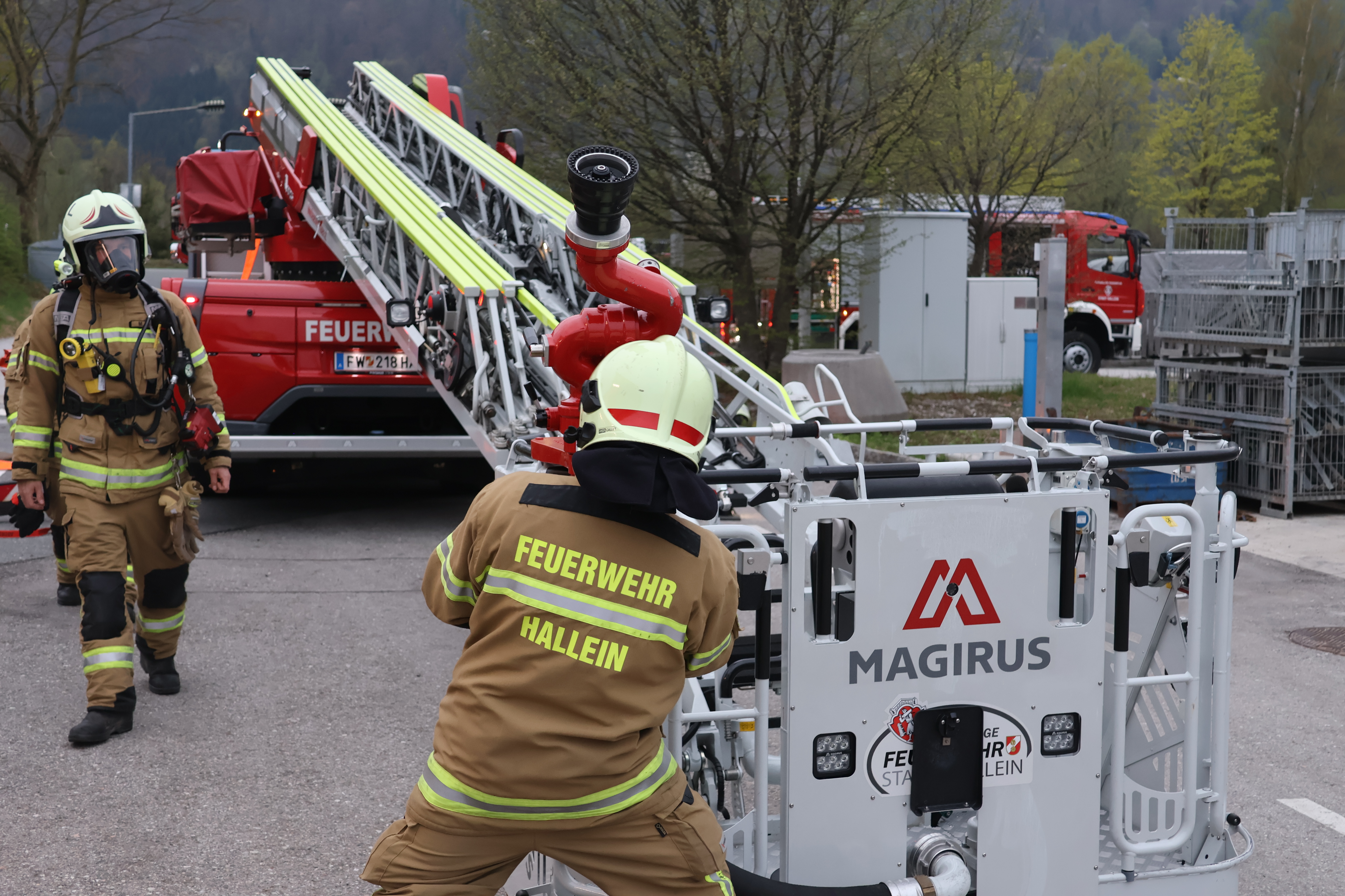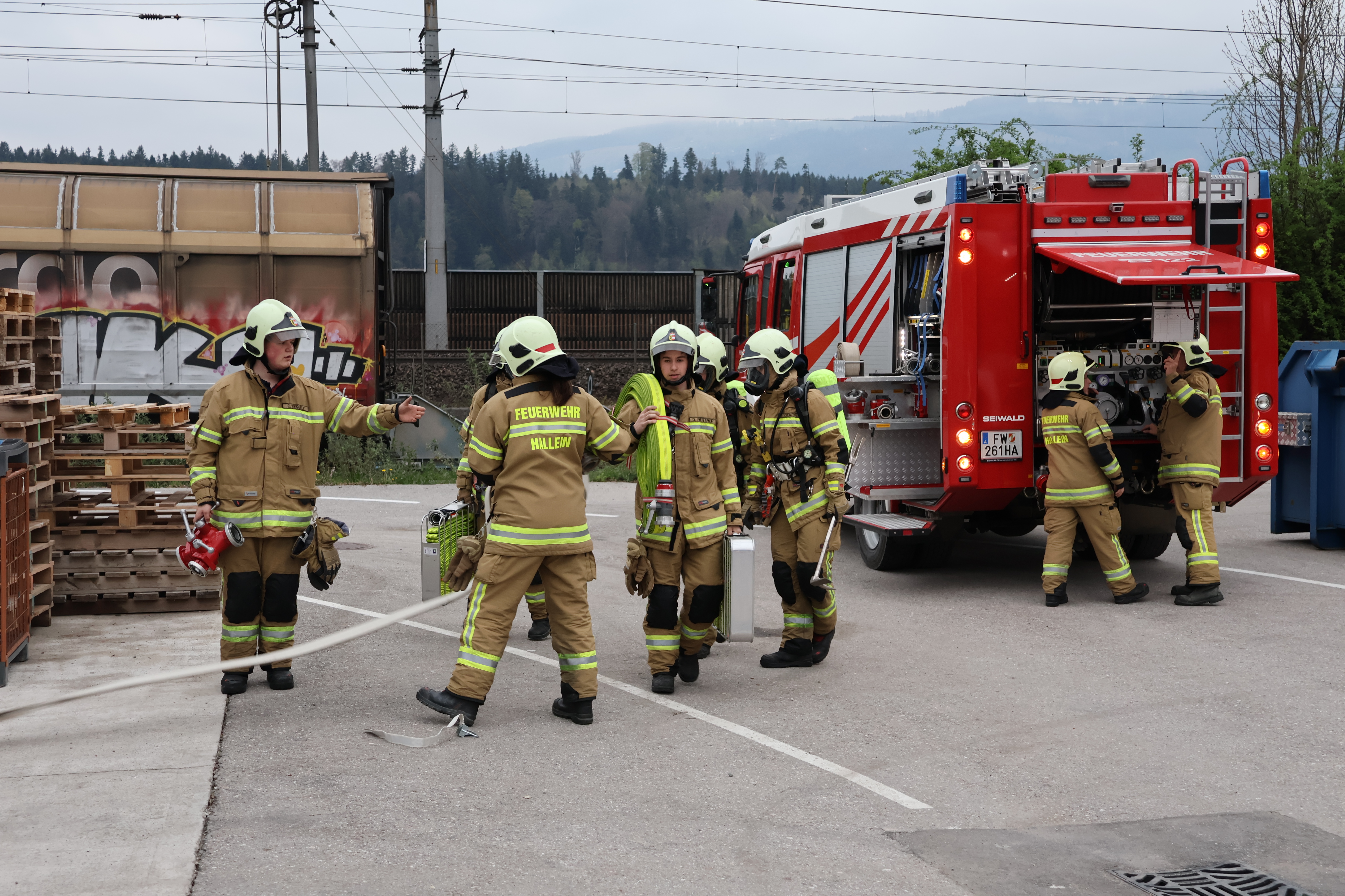 Am Mittwoch, den 15. April, führte die Hauptwache Hallein eine Brandeinsatzübung am Bauhof der Firma Baumeister Frank GmbH durch. Als Übungsszenario wurde ein Brand eines Diesel-Staplers angenommen, der sich rasch auf die Lagerhalle ausbreitete, in der sich das Fahrzeug befand.