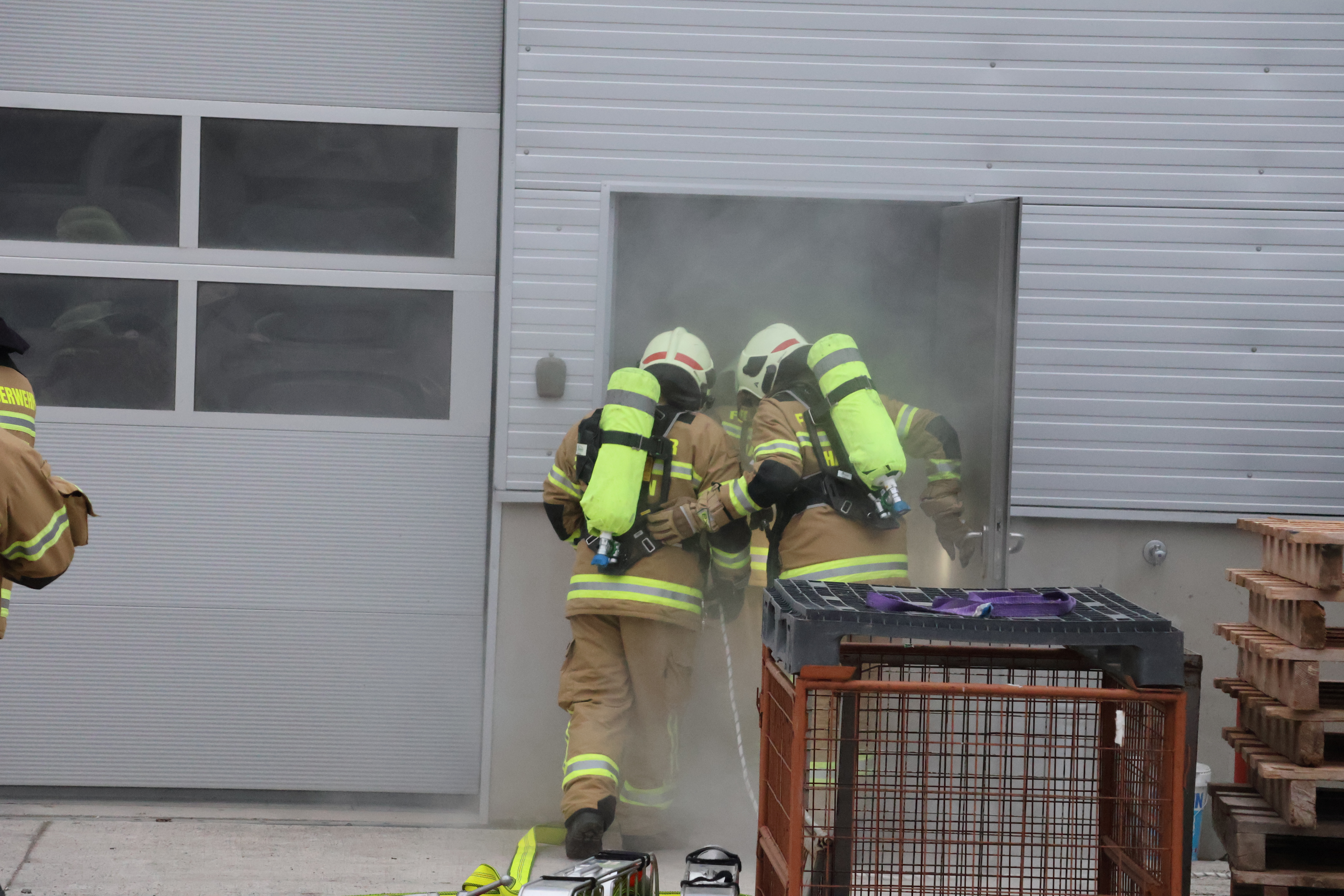 Nach dem Eintreffen des Kommandofahrzeuges wurde umgehend eine erste Lageerkundung durchgeführt. Dabei konnte bereits ein dichter Rauchaustritt aus der Halle festgestellt werden. Zusätzlich meldeten anwesende Firmenangehörige eine vermisste Person, wodurch der Fokus der Einsatzkräfte zunächst auf der Menschenrettung lag.