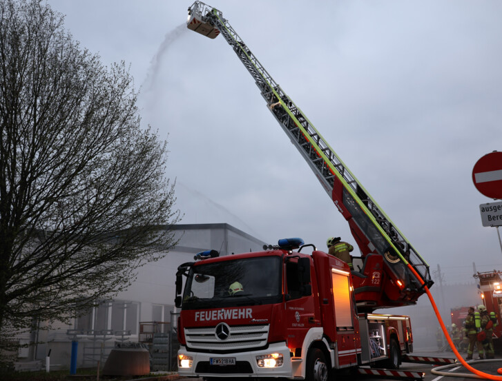 Das Tanklöschfahrzeug 1 begann unmittelbar mit der Menschenrettung und der Brandbekämpfung in der stark verrauchten Lagerhalle unter schwerem Atemschutz. Um eine Ausbreitung des Brandes auf die angrenzende Bahnstrecke zu verhindern, wurde zusätzlich ein mobiler Wasserwerfer in Stellung gebracht. Aufgrund der potenziellen Gefährdung der am Dach installierten Photovoltaikanlage wurde die Drehleiter mit dem Wenderohr eingesetzt, um das Dach gezielt zu kühlen.