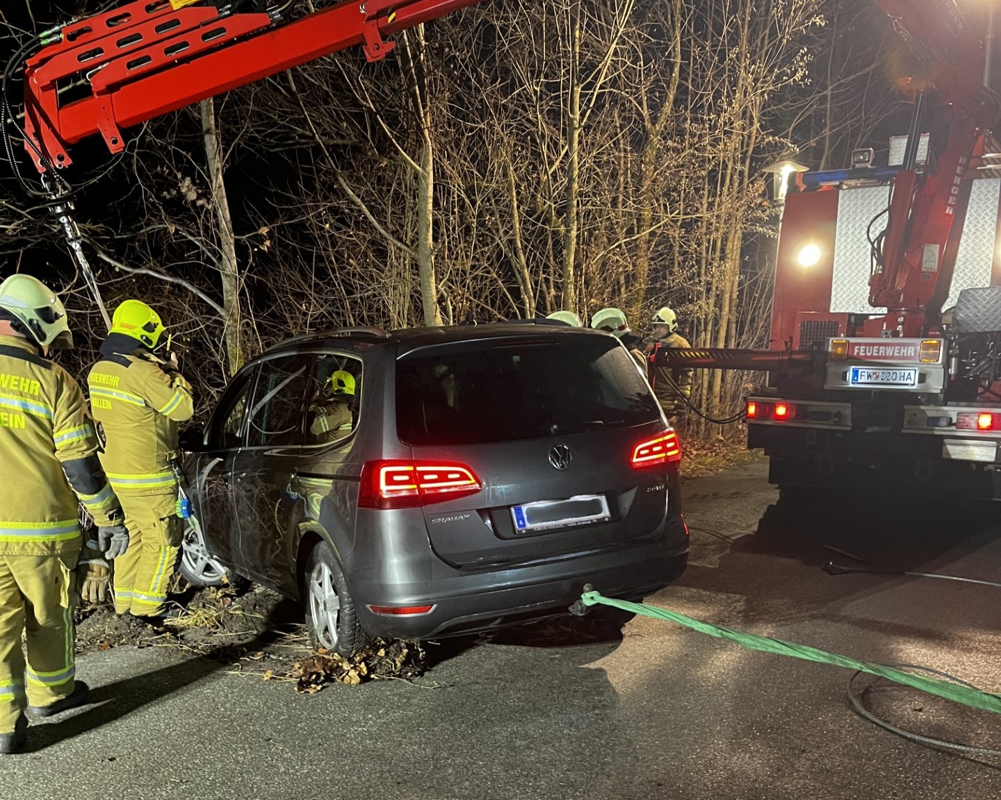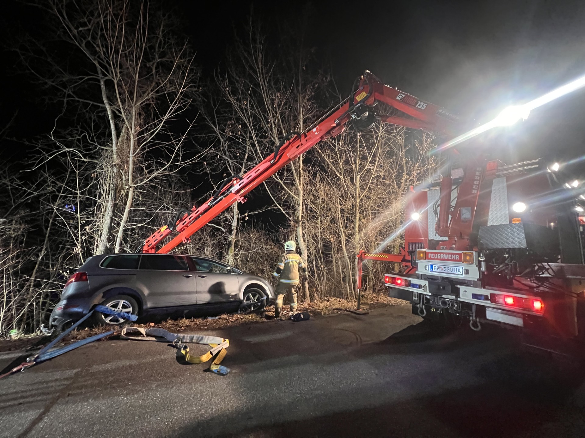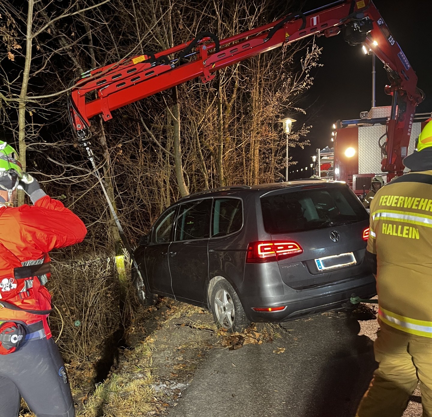 Die Bergung erfolgte mittels Kran des Rüst Hallein (SRFKA) und Seilwinde des Rüstlösch Hallein (RLFA 2000). Der PKW wurde schonend und sicher wieder auf die Straße gehoben.