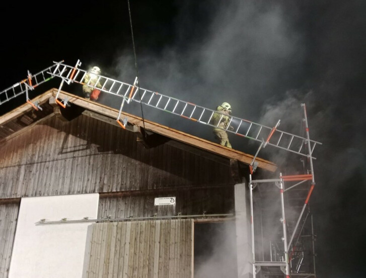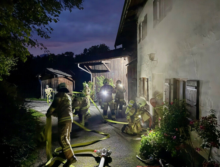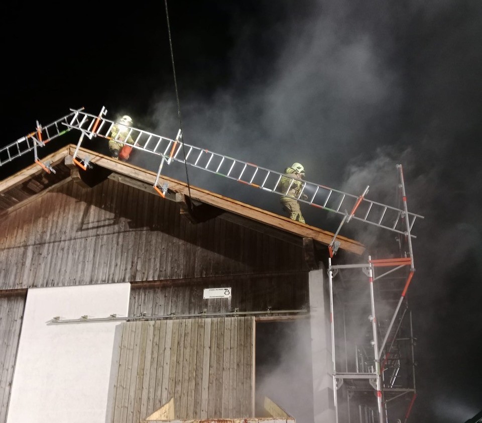 Dürrnberg mit der Brandbekämpfung von außen mittels C-Hohlstrahlrohr. Die Besatzung der Pumpe Dürrnberg kümmerte sich währenddessen um die gesicherte Rettung der verletzten, jedoch noch gehfähigen Person vom Dach des Gebäudes.