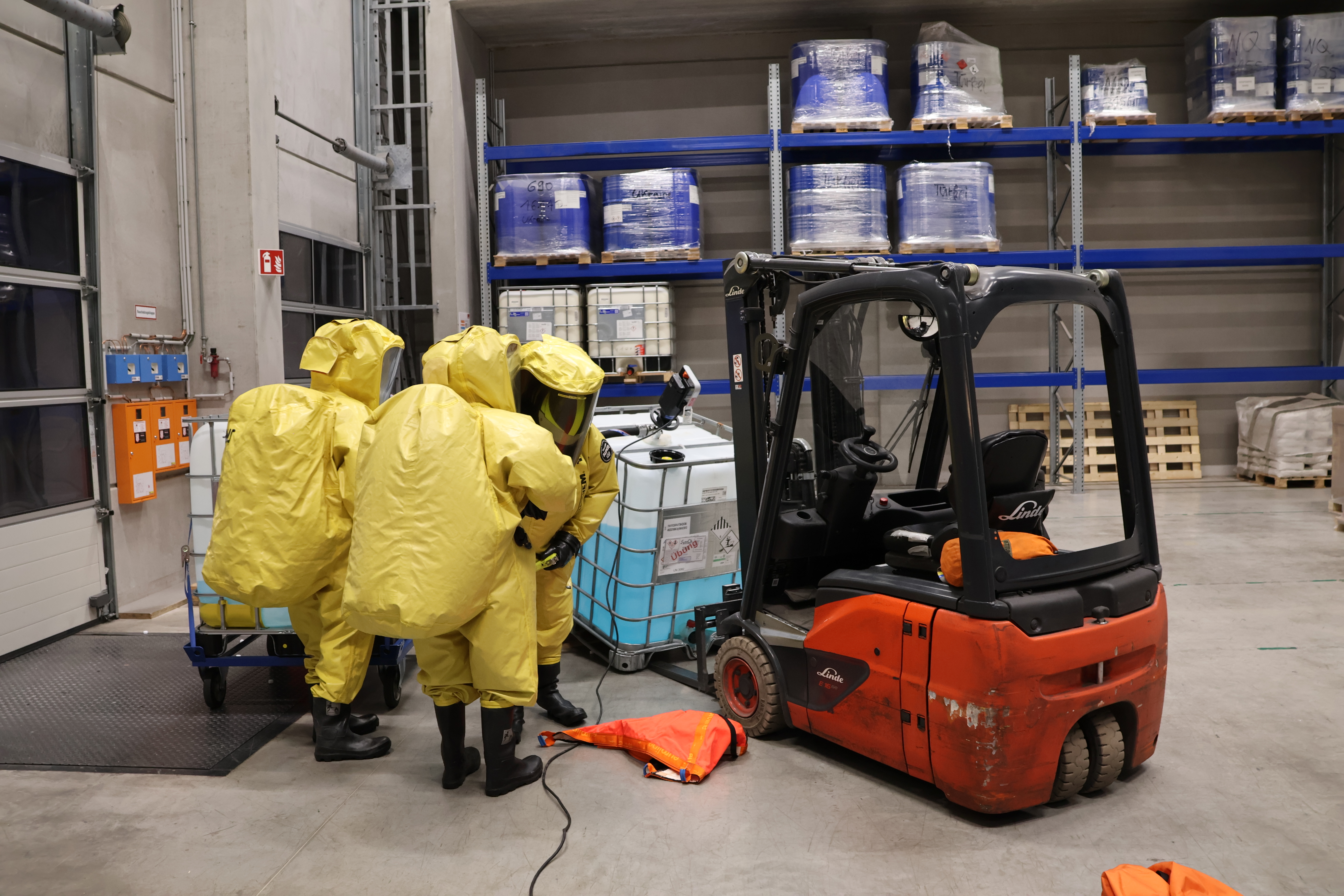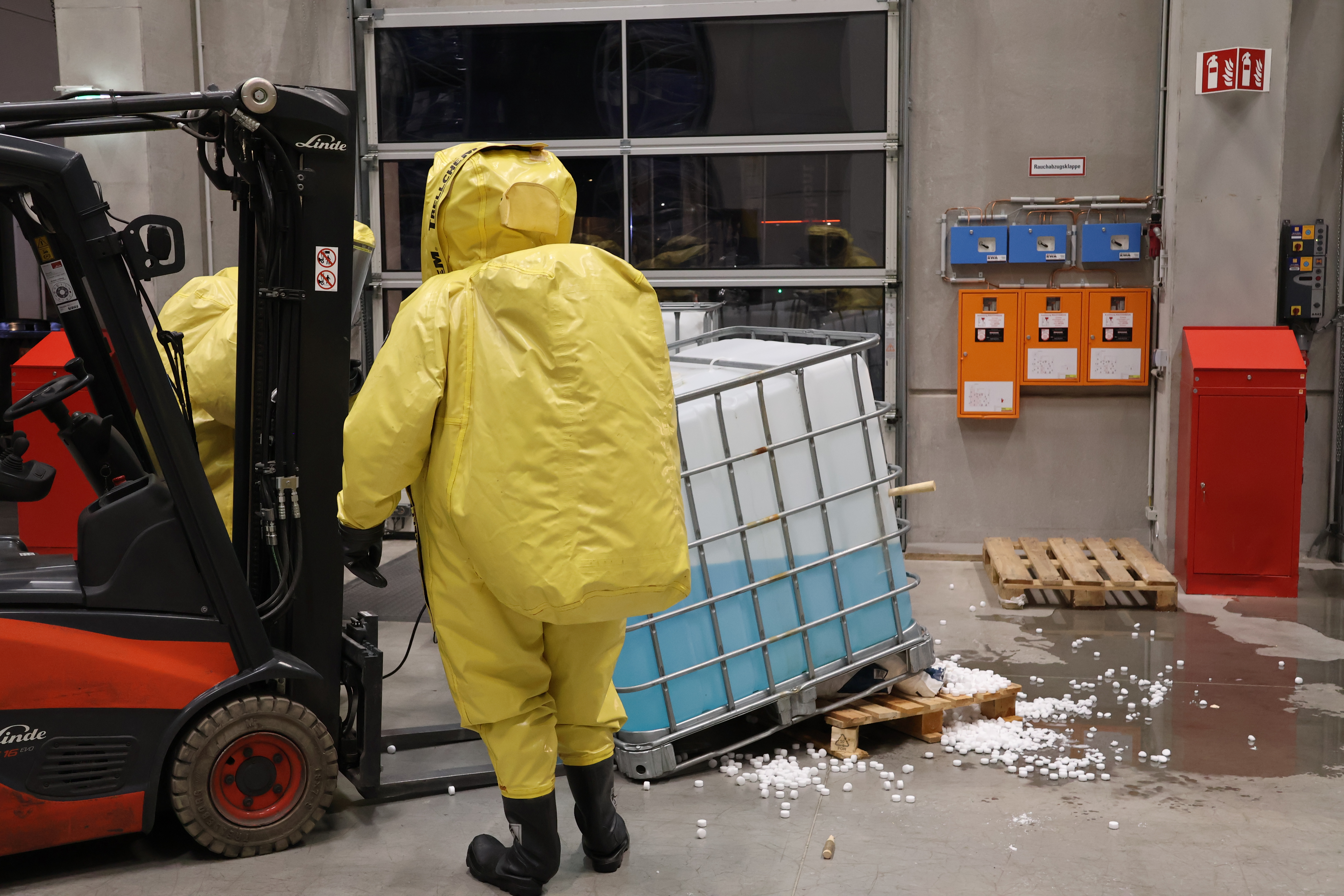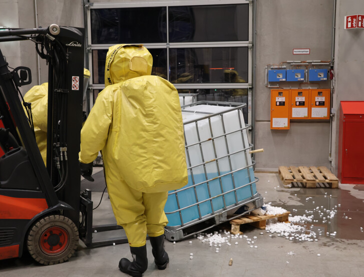 Als Ausgangslage wurde ein Unfall in einem Gewerbebetrieb simuliert: Beim Absetzen einer Palette mit einem Gabelstapler wurde ein IBC-Behälter mit einer brennbaren Flüssigkeit beschädigt. Gleichzeitig kam es zur Beschädigung einer zweiten Palette, auf der sich ein Gebinde mit einem festen Stoff – Natriumhydroxid – befand. Dadurch entstand eine gefährliche Mischung aus flüssigen und festen Stoffen mit chemischer Reaktionsgefahr.
