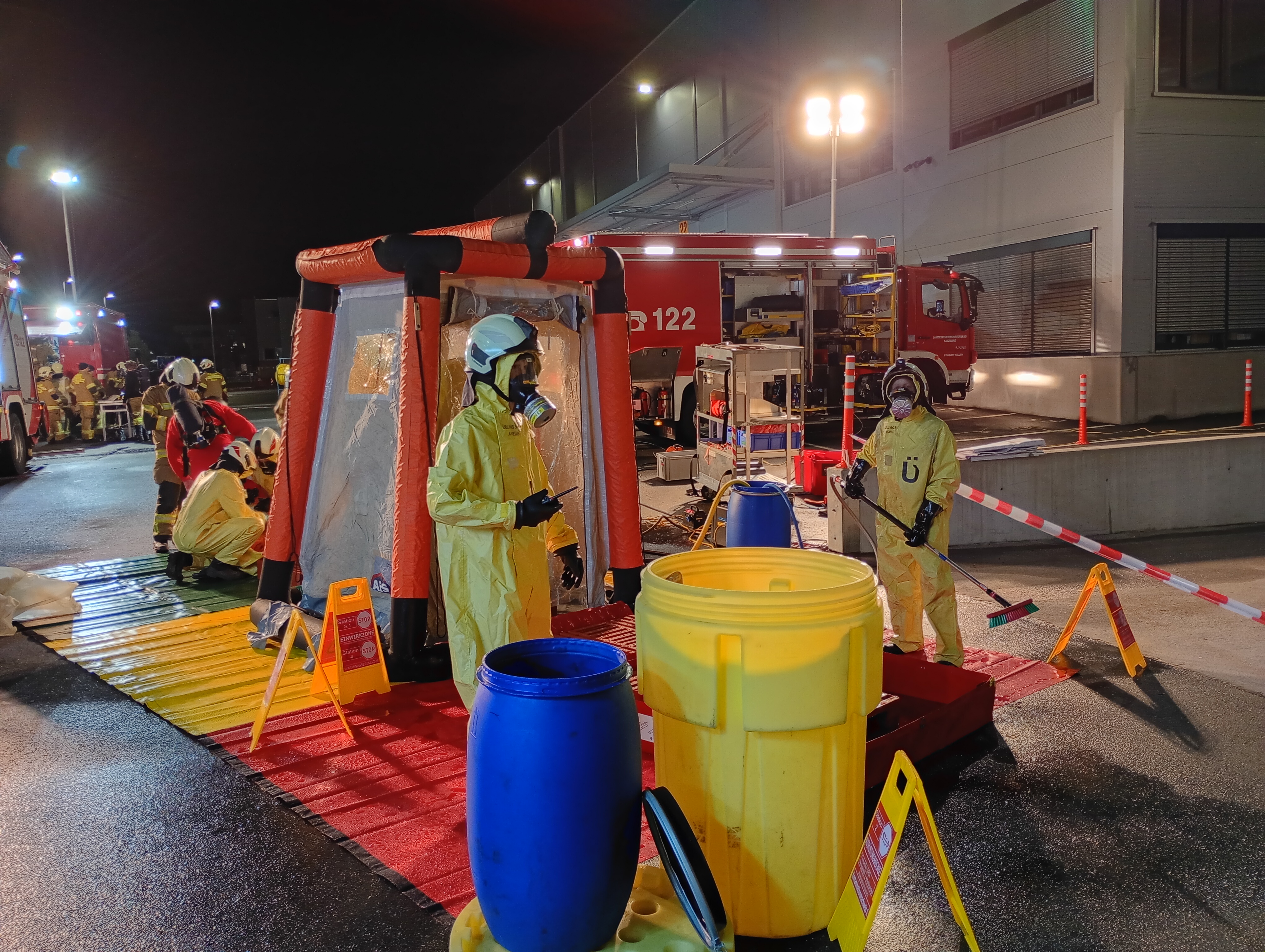Parallel dazu wurde ein provisorischer Not-Dekontaminationsplatz eingerichtet, um eine mögliche Kontamination der Einsatzkräfte rasch behandeln zu können.