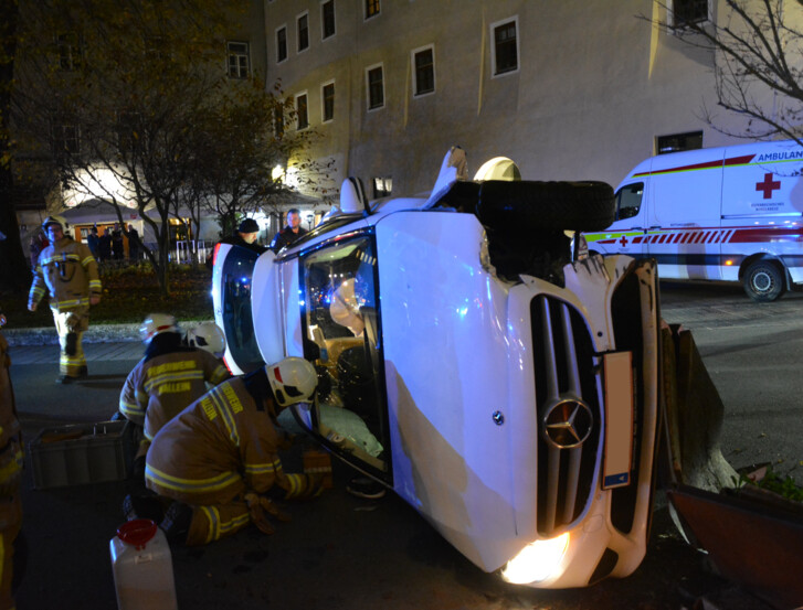 Beim Eintreffen des Einsatzleiters zeigte sich folgende Lage: Ein Pkw lag nach einer Kollision mit einem Blumentrog seitlich auf der Fahrbahn. Glücklicherweise konnte der Lenker bereits vor dem Eintreffen der Einsatzkräfte von Passanten aus dem Fahrzeug befreit werden. Das Rote Kreuz übernahm umgehend die medizinische Versorgung des Fahrers.