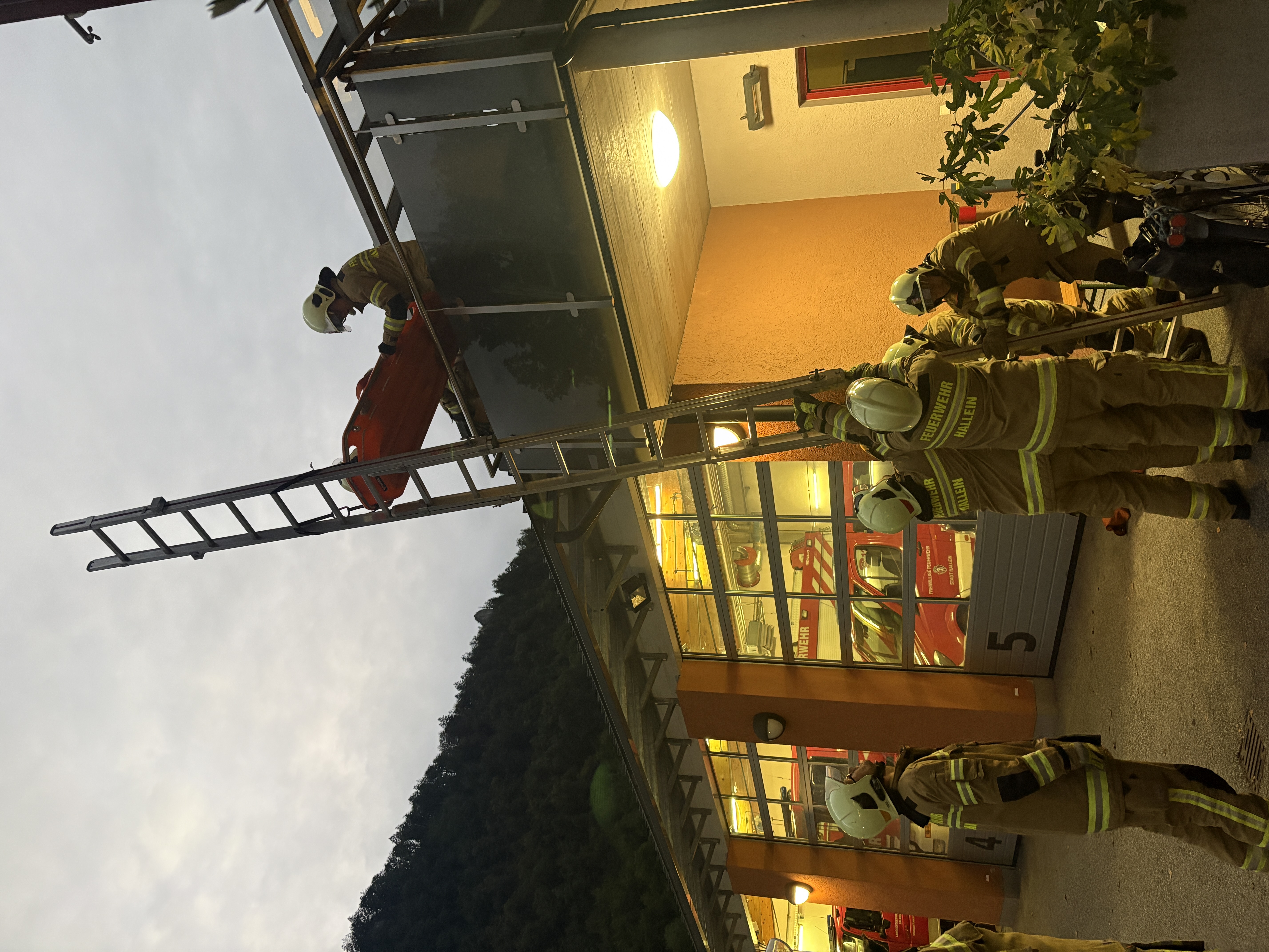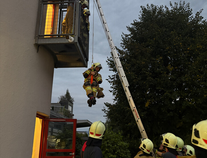 Für dieses Szenario wurde eine zweiteilige Schiebeleiter am Balkon angeleitert. Mithilfe eines Rettungsdreiecks und einer Rettungsleine konnten mehrere Personen rasch und dennoch kontrolliert gerettet werden. An der Leiter wurde mittels Bandschlinge ein stabiler Ankerpunkt eingerichtet, über den die Leine geführt und unten ein Abseilachter eingebaut wurde. Dadurch war es möglich, die Personen mit wenig Kraftaufwand und gut gebremst nach unten abzuseilen.
