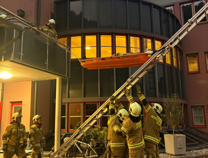 Die Besatzung der Pumpe Dürrnberg kümmerte sich derweil um die Rettung der durch die Rauchentwicklung eingeschlossenen Person. Mithilfe des Rollgliss konnte diese gesichert aus dem Haus gebracht werden.