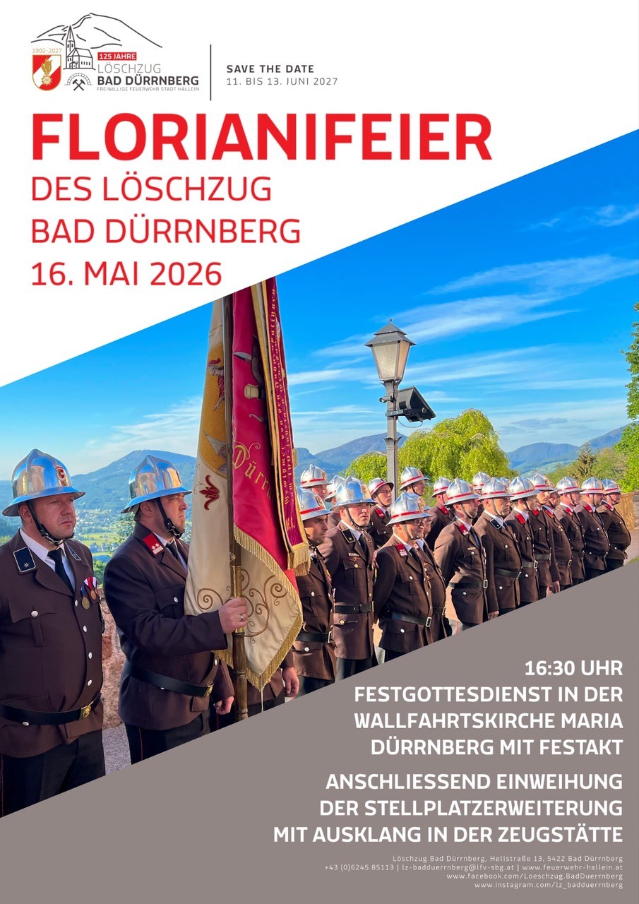Am Samstag, den 16. Mai 2026 findet am Dürrnberg die alljährliche Florianifeier statt. Zu diesem Anlass legt der Löschzug Rechenschaft gegenüber der Bevölkerung ab, es werden besondere Dienste ausgezeichnet und Beförderungen durchgeführt. ab 16:30 Uhr Festgottesdienst in...