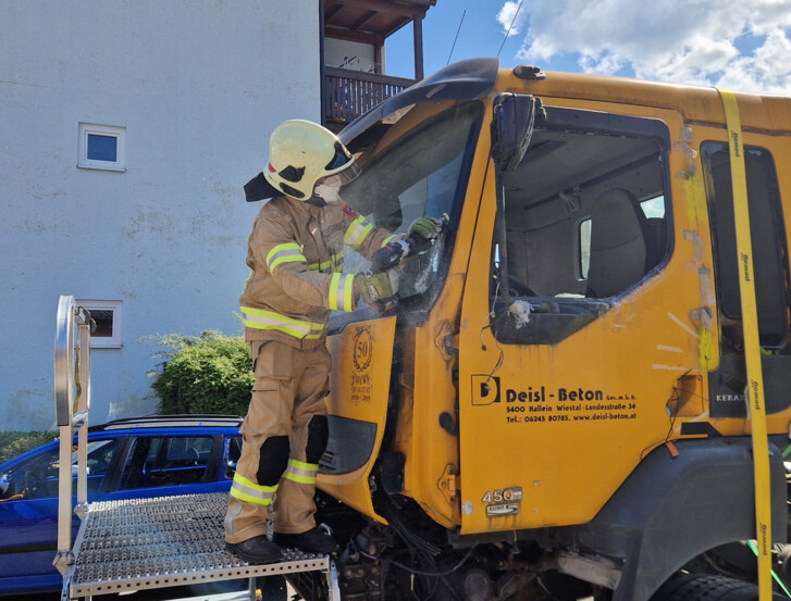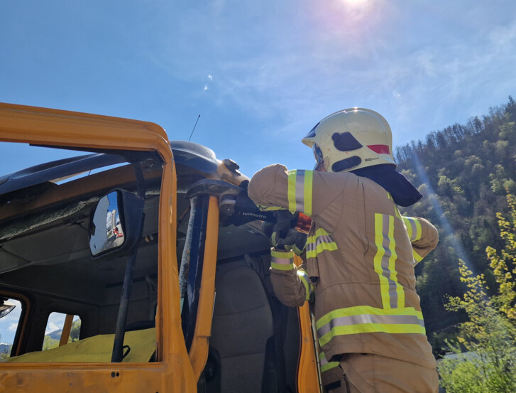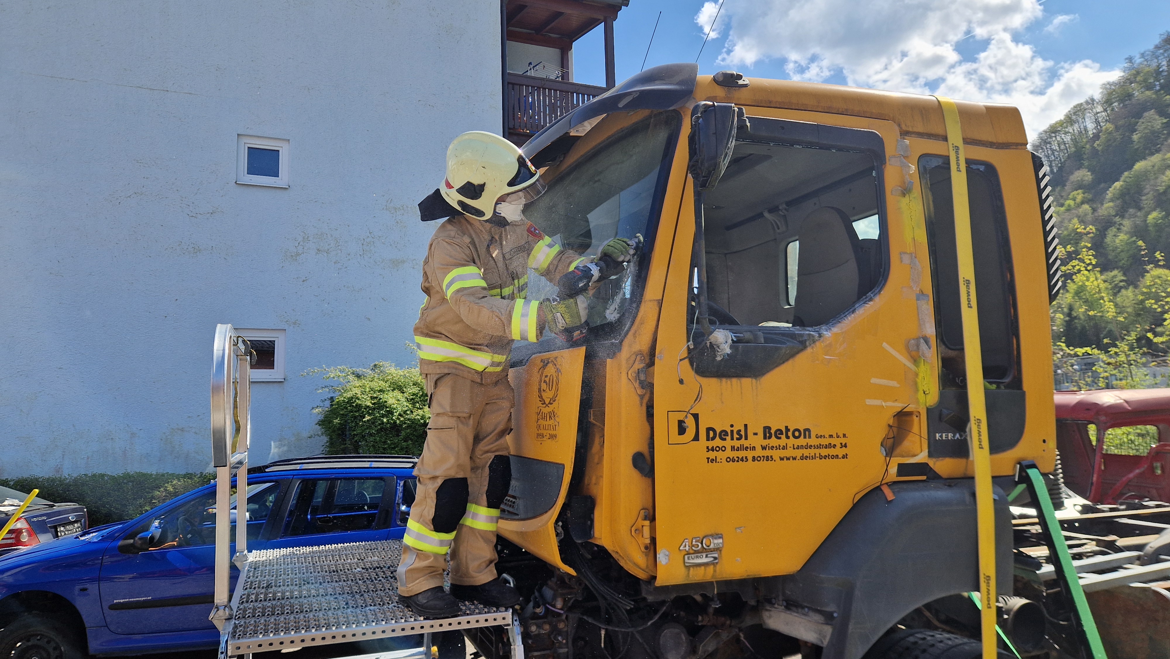 Im Anschluss wurde an einem ausgemusterten LKW der Firma Deisl-Beton Ges.m.b.H. intensiv gearbeitet. Dabei standen Sicherungsmaßnahmen sowie verschiedene Schnitt- und Rettungstechniken im Fokus. Der Ausbildungstag wurde durch eine ausführliche Nachbesprechung abgerundet und bot zahlreiche wertvolle Erkenntnisse.