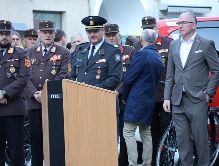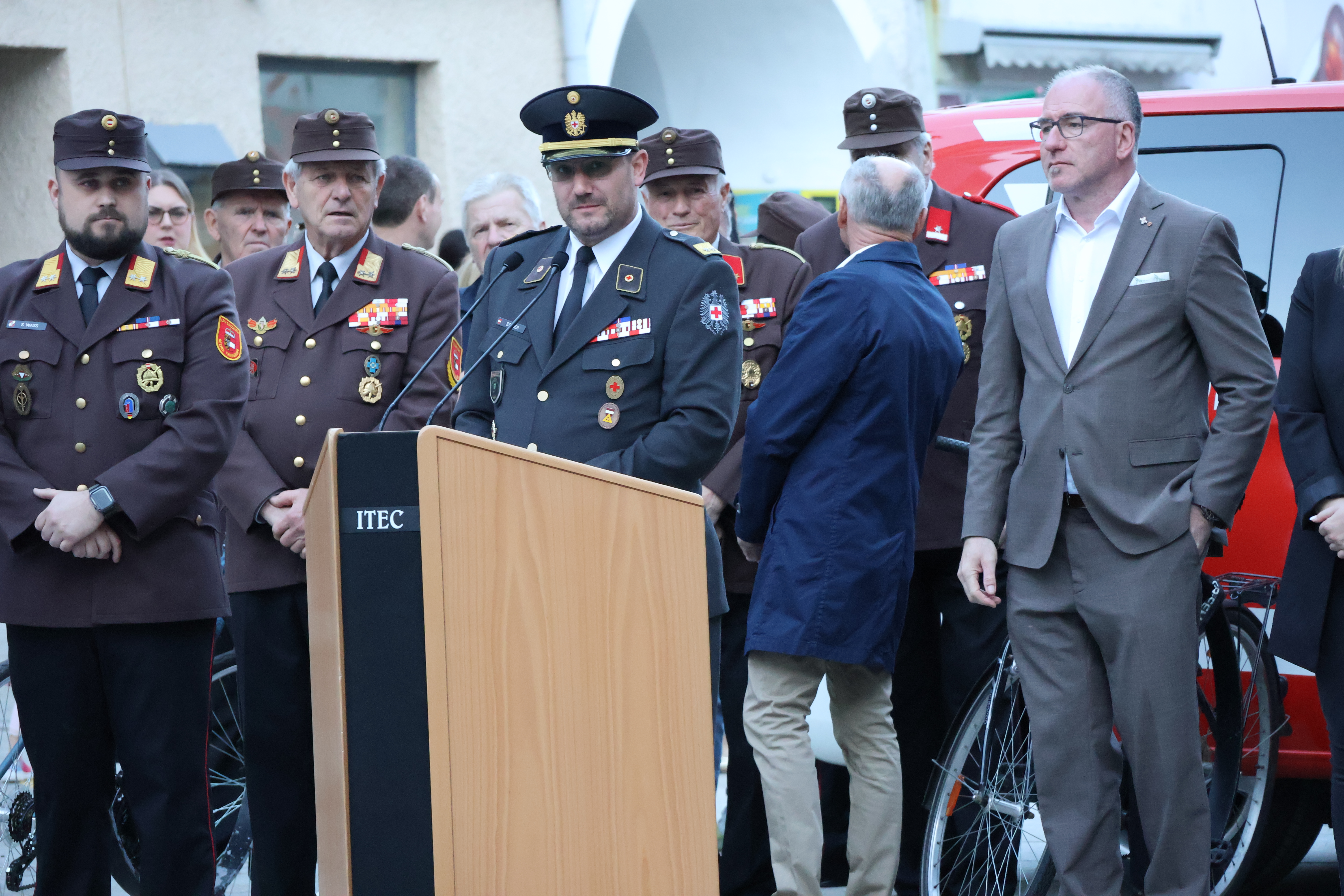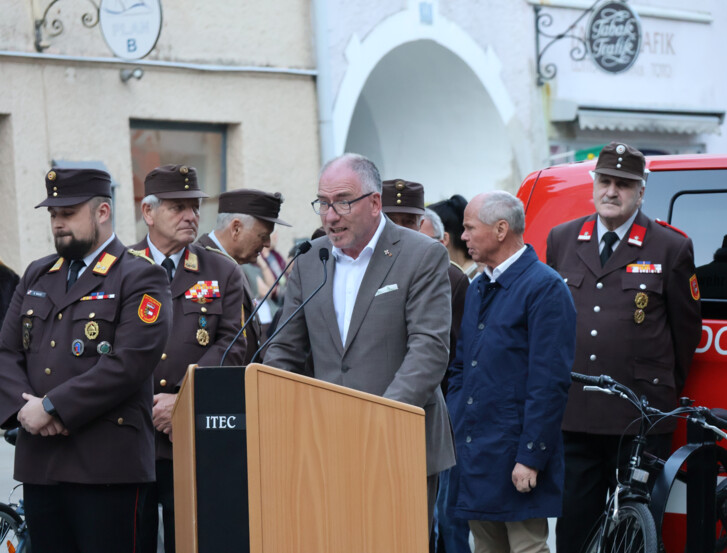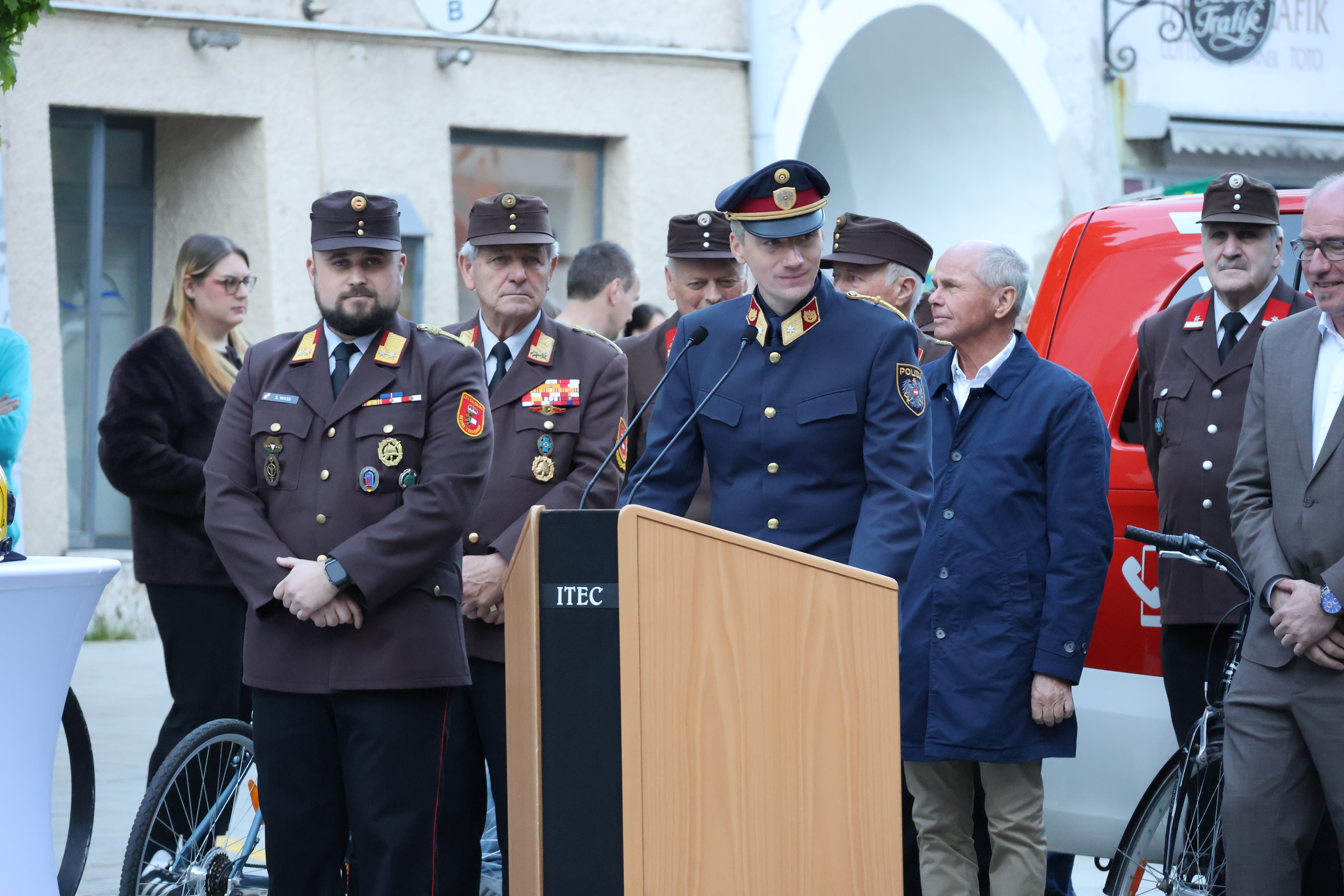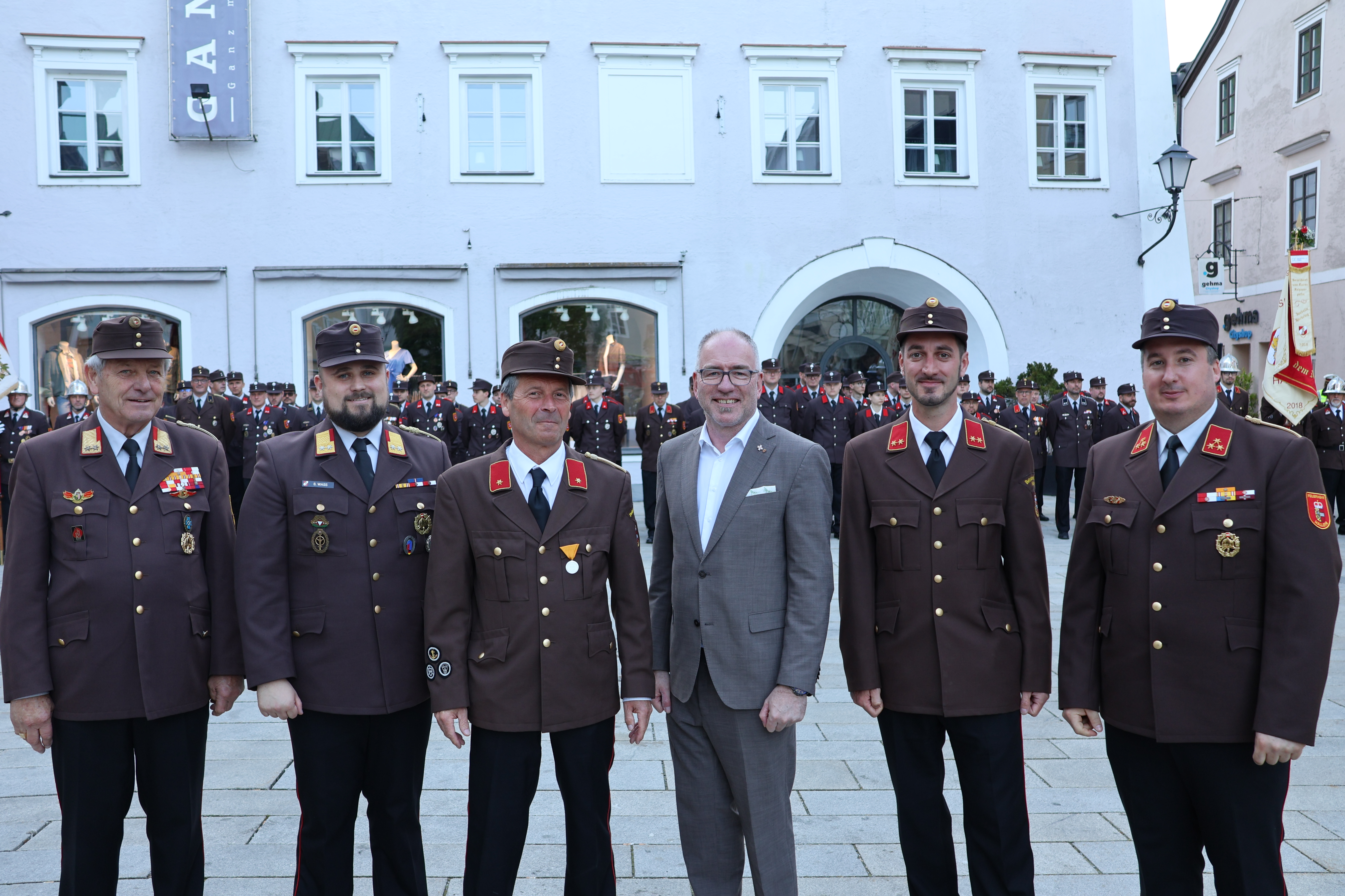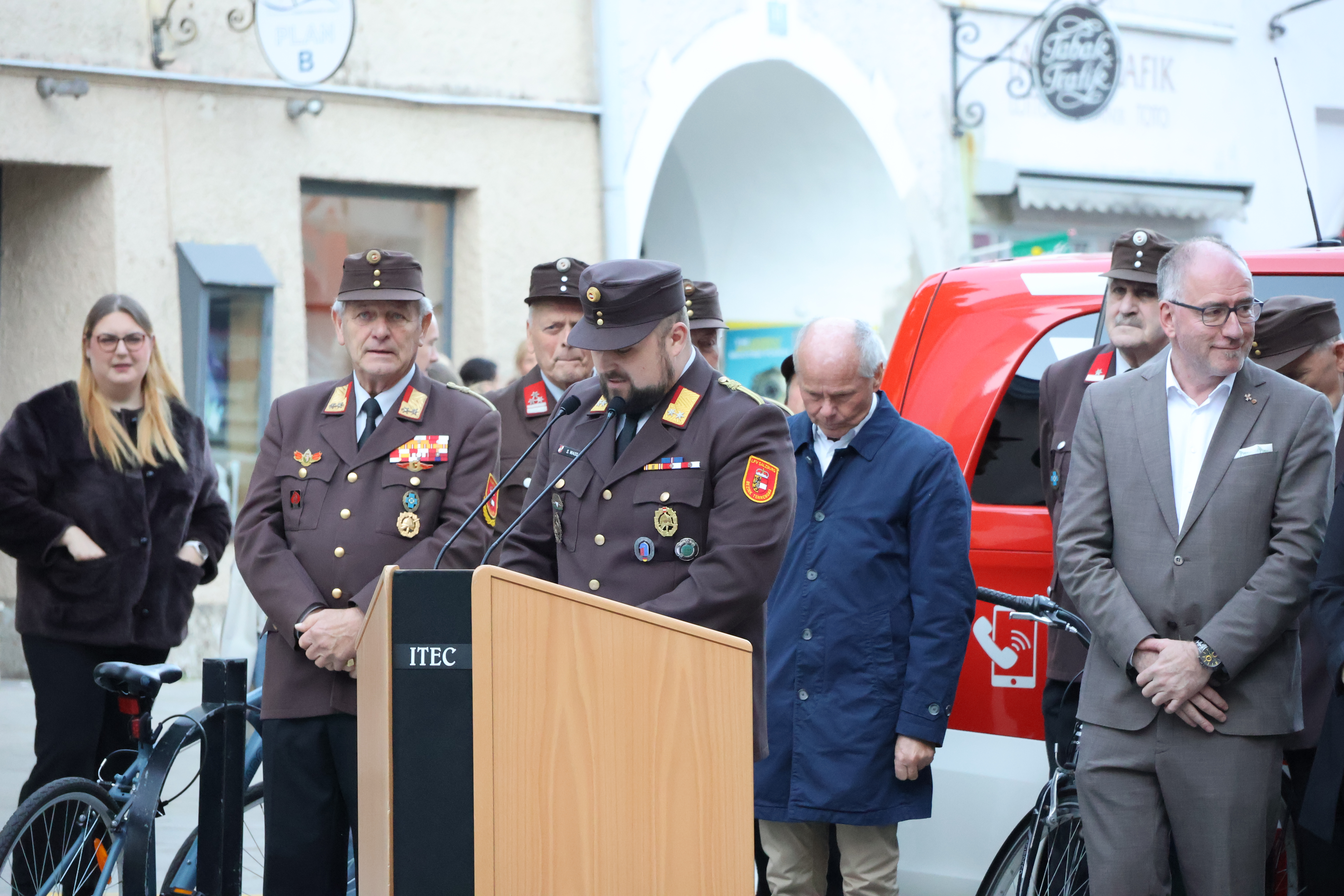Im Anschluss daran fand am Kornsteinplatz der offizielle Festakt statt. Ortsfeuerwehrkommandant BR Sebastian Wass konnte dabei zahlreiche Ehrengäste aus Politik und Feuerwehrwesen begrüßen, darunter auch Bürgermeister Alexander Stangassinger.