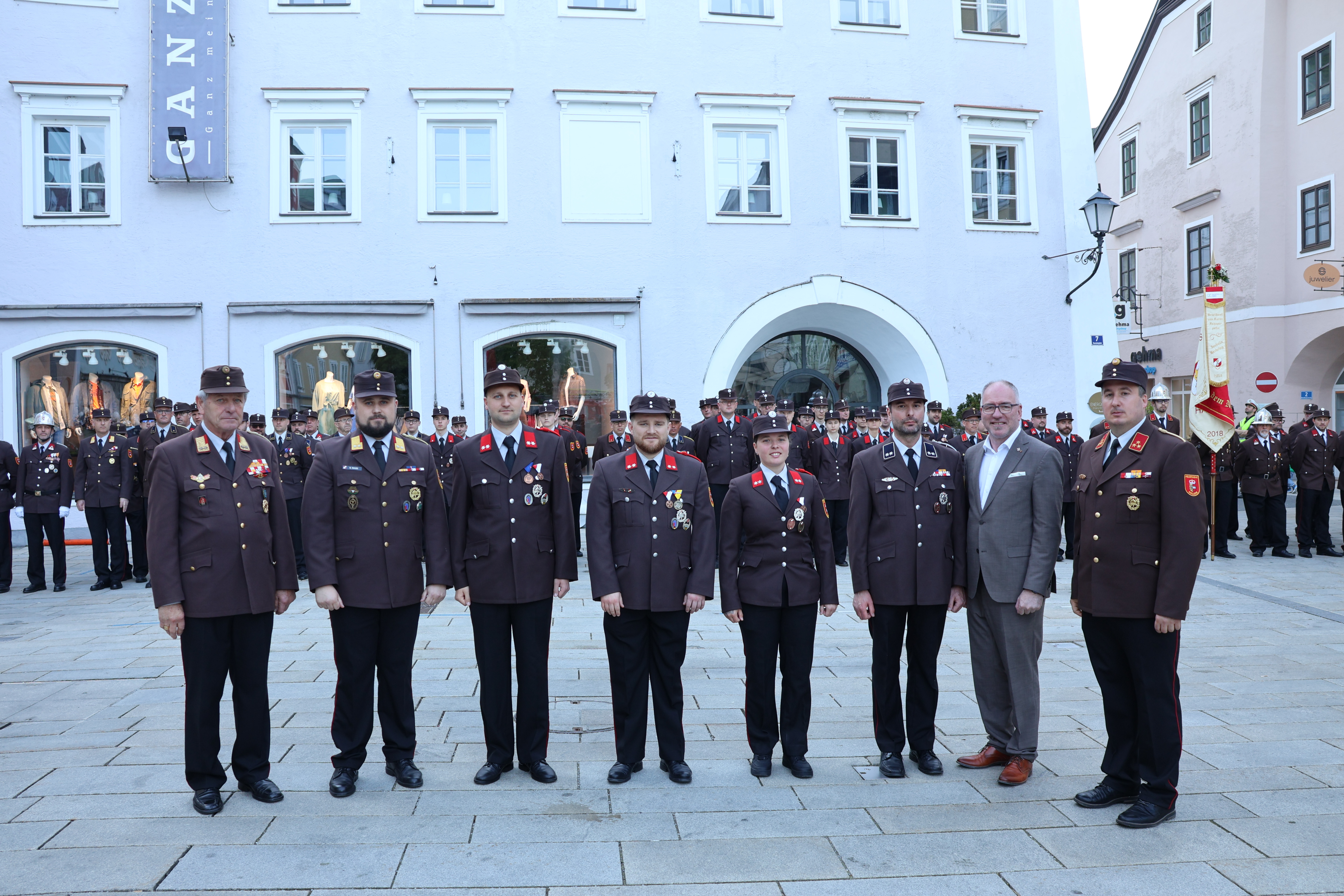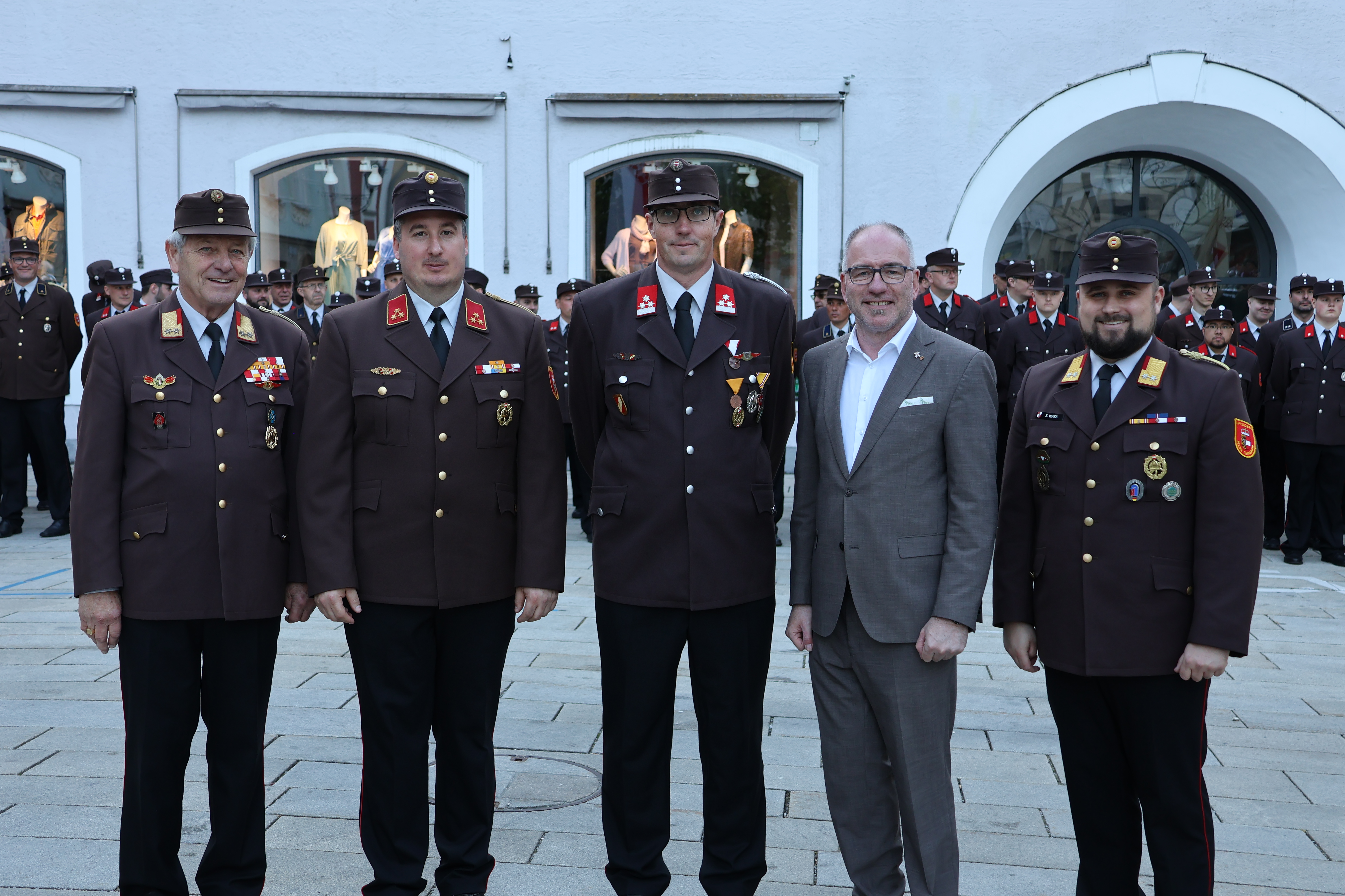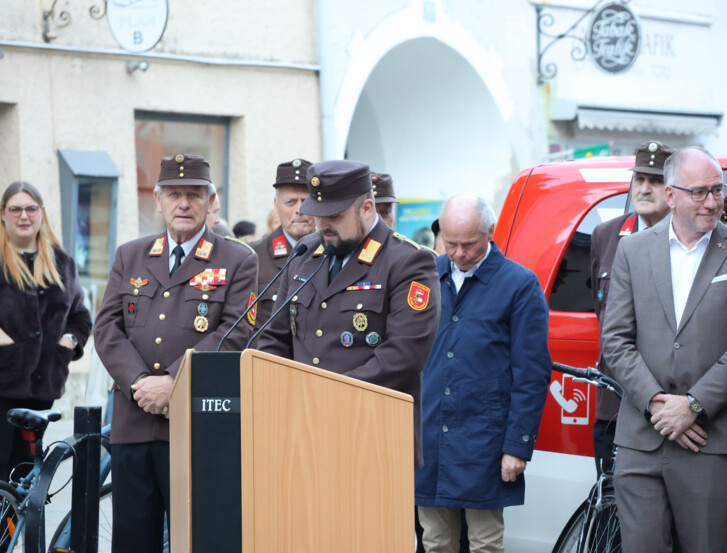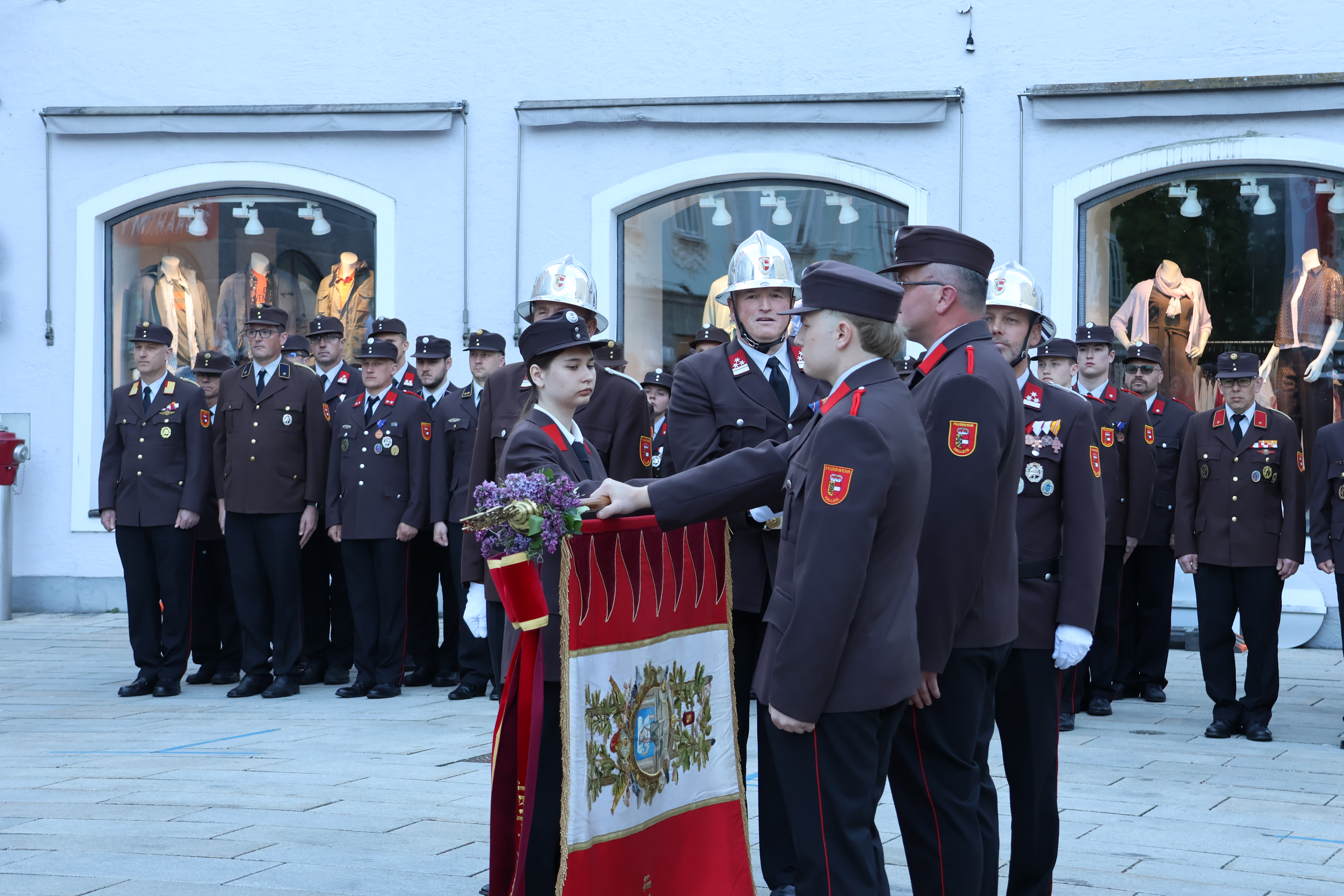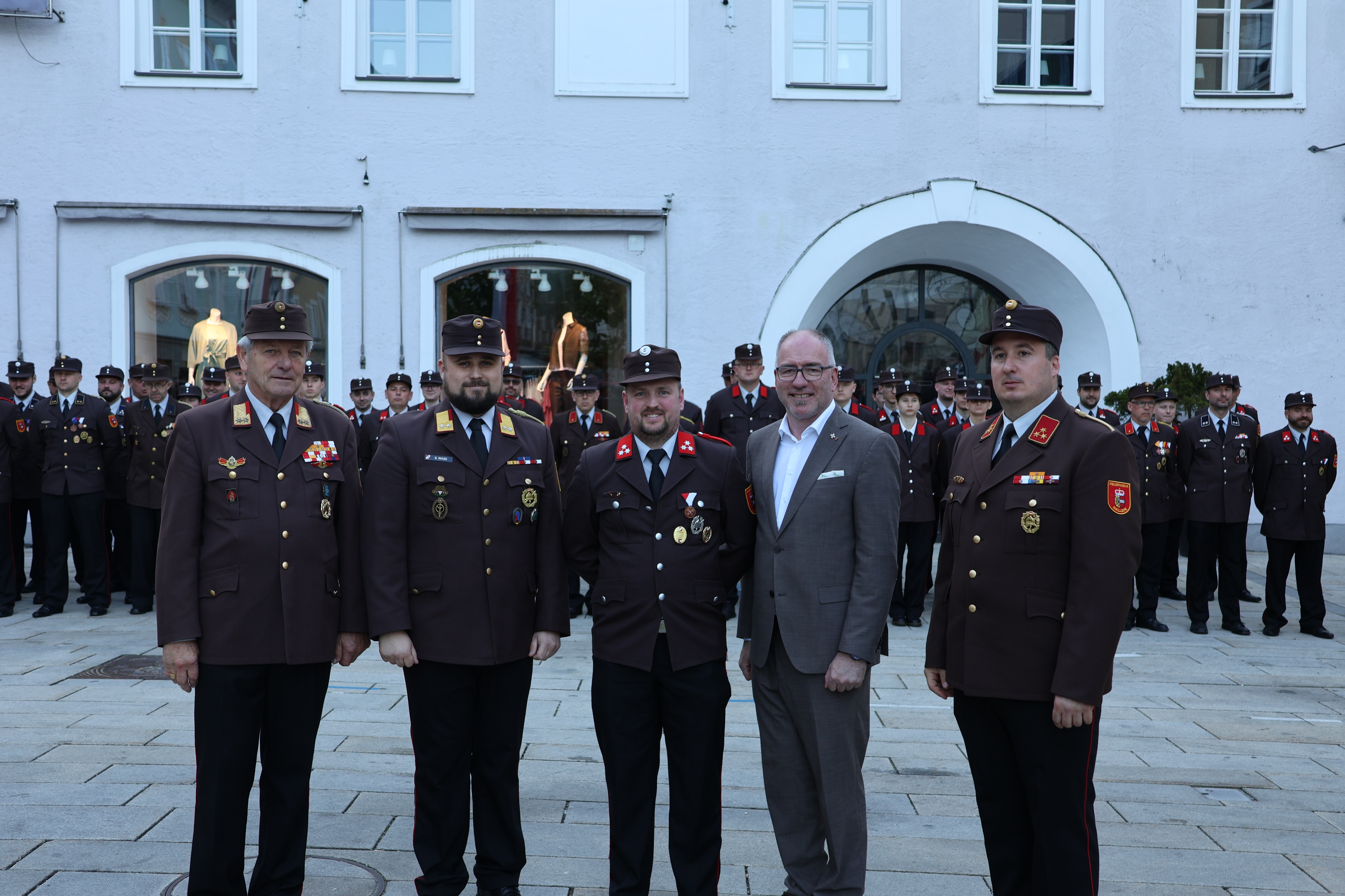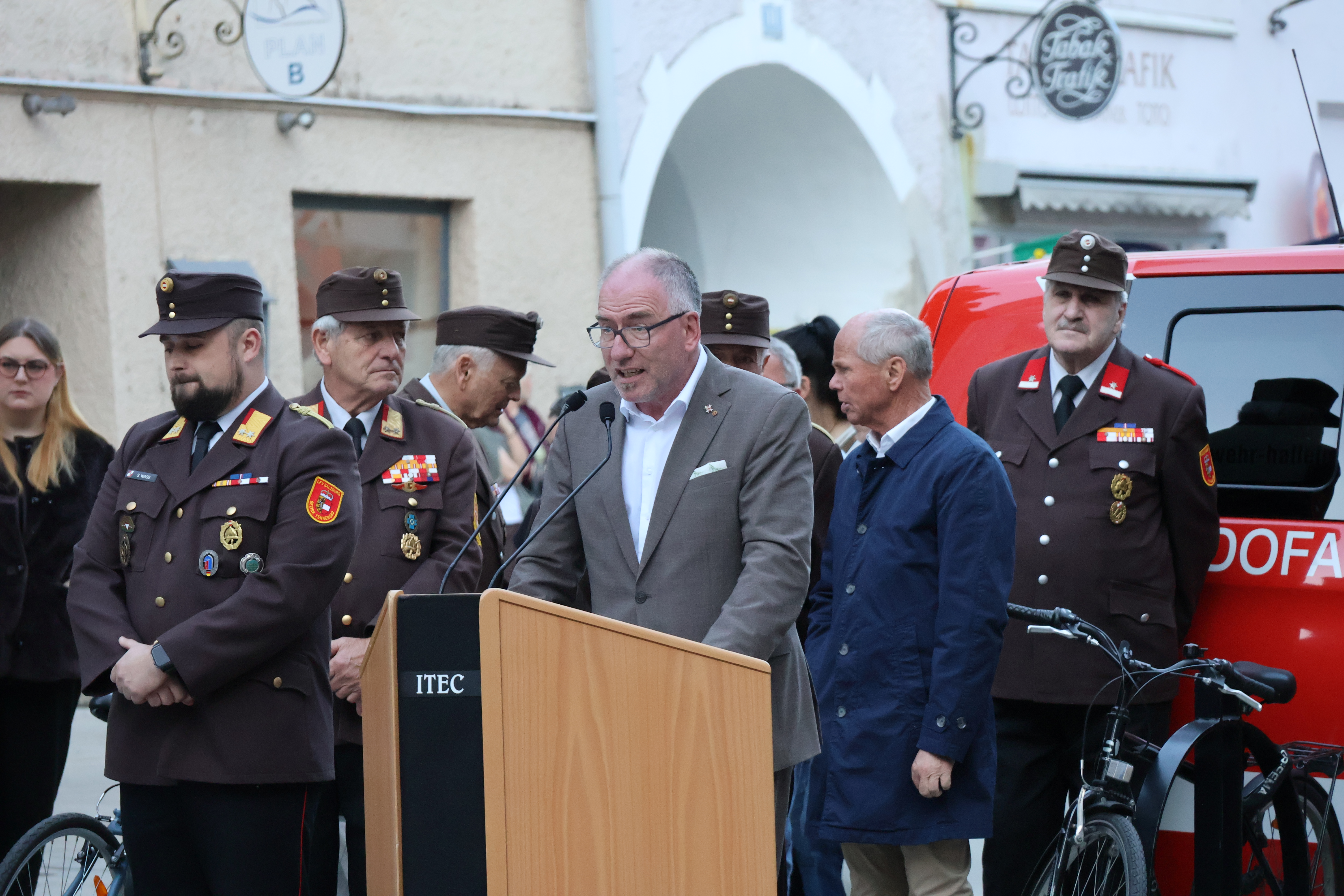 Im Anschluss daran fand am Kornsteinplatz der offizielle Festakt statt. Ortsfeuerwehrkommandant BR Sebastian Wass konnte dabei zahlreiche Ehrengäste aus Politik und Feuerwehrwesen begrüßen, darunter auch Bürgermeister Alexander Stangassinger.