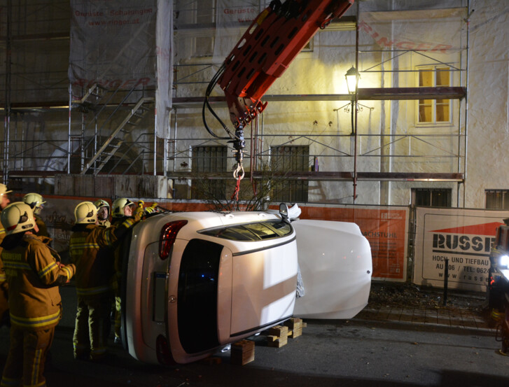 Nach der Freigabe durch die Polizei wurde das auf der Seite liegende Fahrzeug mit dem Kran des Schweren Rüstfahrzeugs wieder auf die Räder gestellt, sodass es anschließend durch ein Abschleppunternehmen abtransportiert werden konnte.
