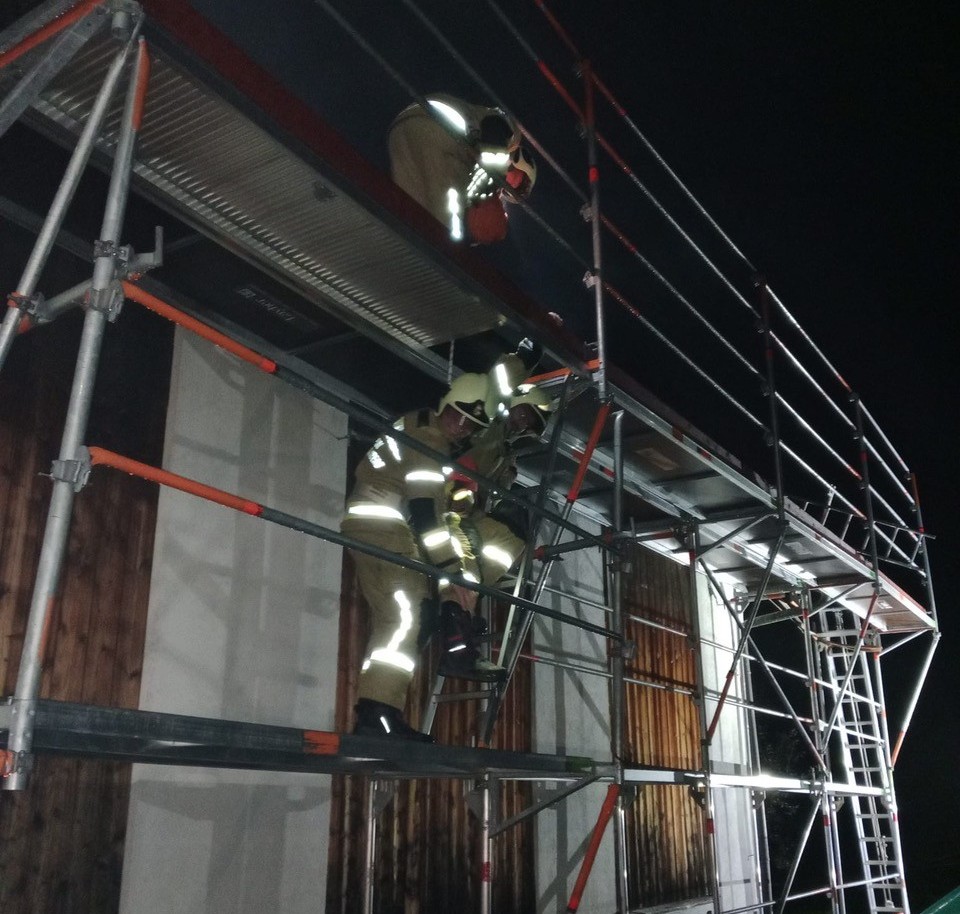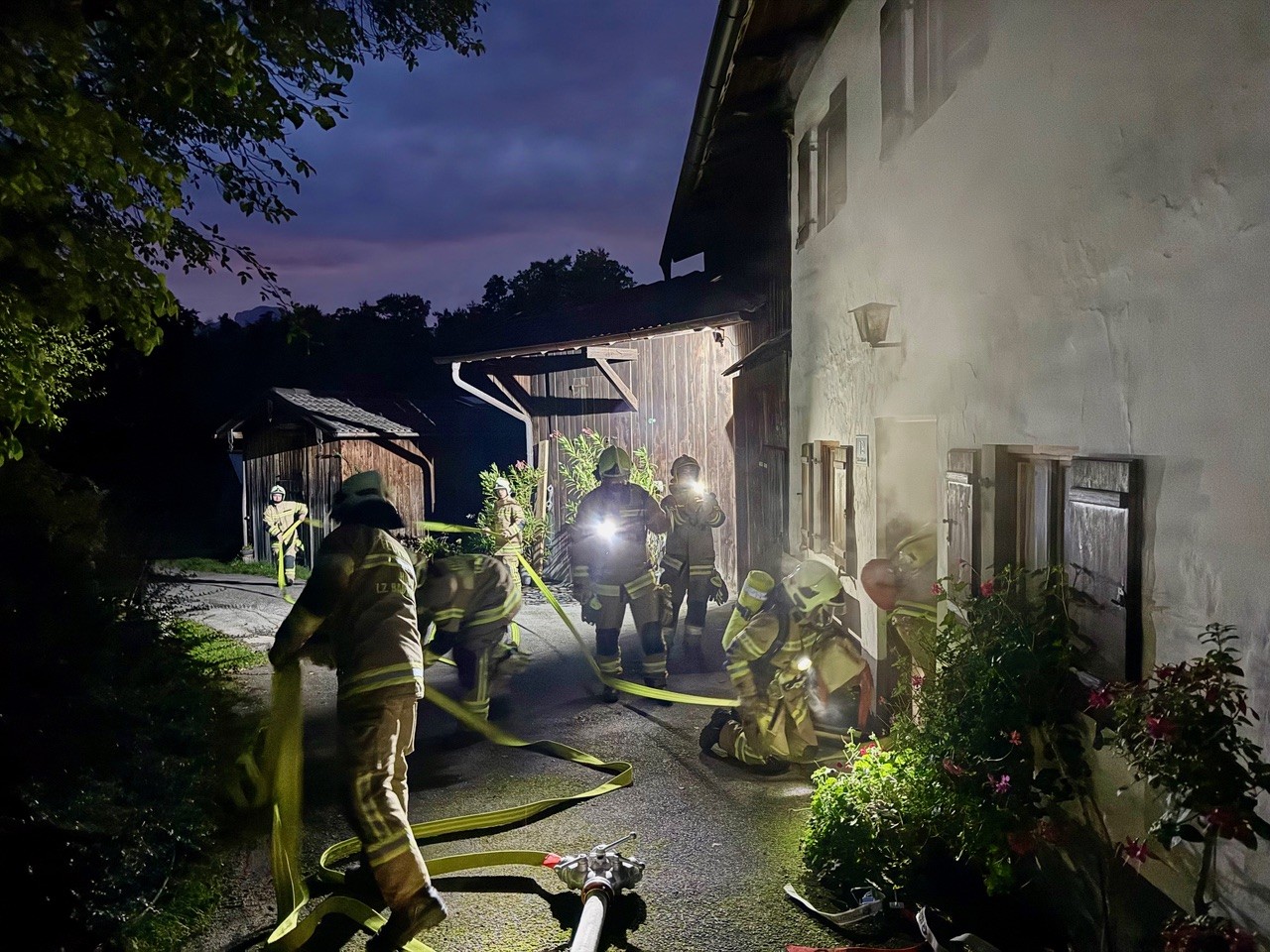 Dürrnberg mit der Brandbekämpfung von außen mittels C-Hohlstrahlrohr. Die Besatzung der Pumpe Dürrnberg kümmerte sich währenddessen um die gesicherte Rettung der verletzten, jedoch noch gehfähigen Person vom Dach des Gebäudes.