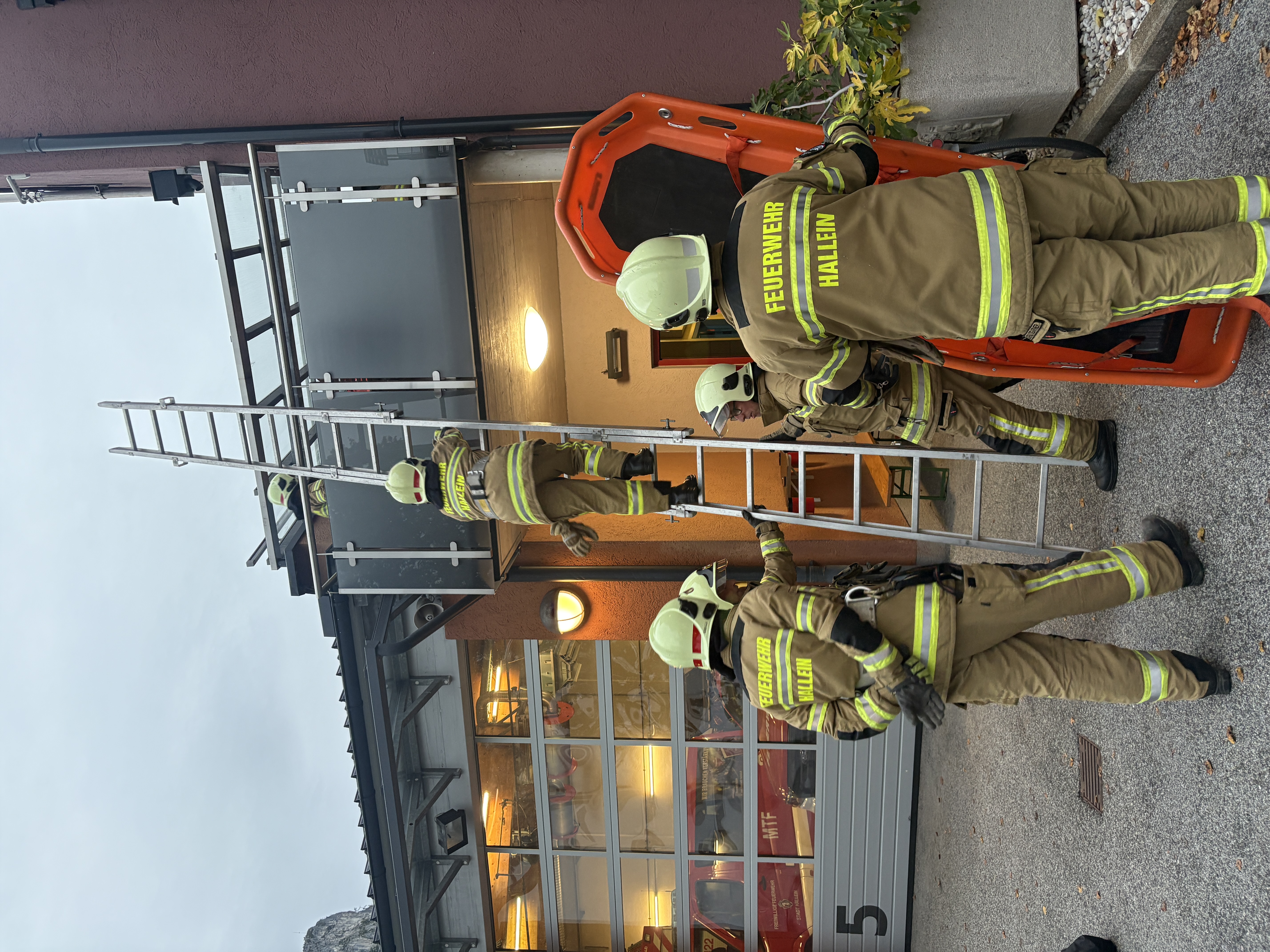 Die Besatzung der Pumpe Dürrnberg kümmerte sich derweil um die Rettung der durch die Rauchentwicklung eingeschlossenen Person. Mithilfe des Rollgliss konnte diese gesichert aus dem Haus gebracht werden.