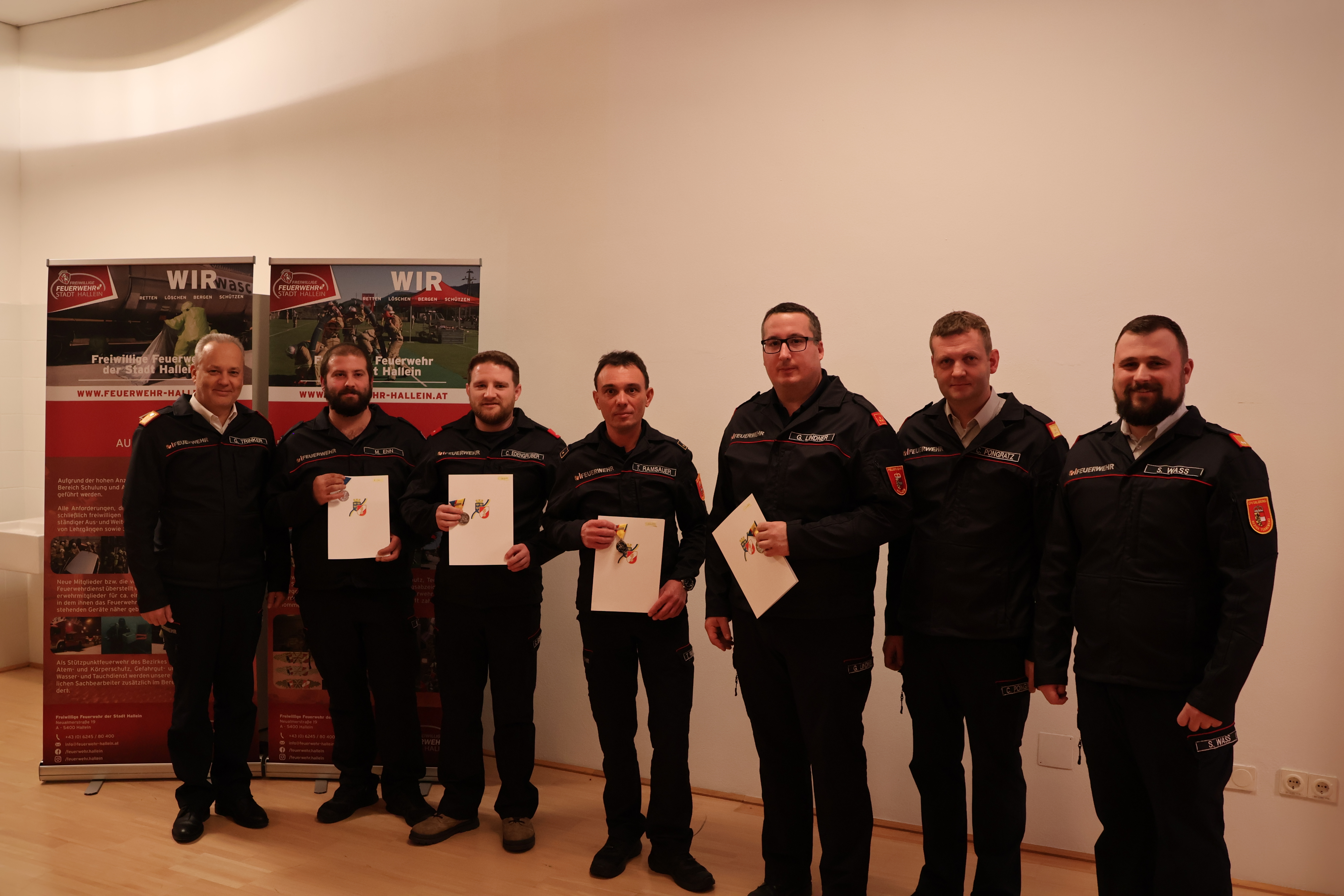 Ein außergewöhnlicher Programmpunkt dieser Abschlussübung war die Verleihung der Katastrophenmedaillen für den Hochwassereinsatz 2024 in Niederösterreich. Vier Kameraden der Feuerwehr Hallein waren bei diesem Einsatz beteiligt. Die Katastrophenmedaille wurde gemeinsam von unserem Ortsfeuerwehrkommandanten, dem Bezirksfeuerwehrkommandanten sowie dem Landesfeuerwehrkommandanten an die Kameraden HBI Gerald Lindner, VI Thomas Ramsauer, HV Manuel Enn und OFM Christian Edengruber überreicht.