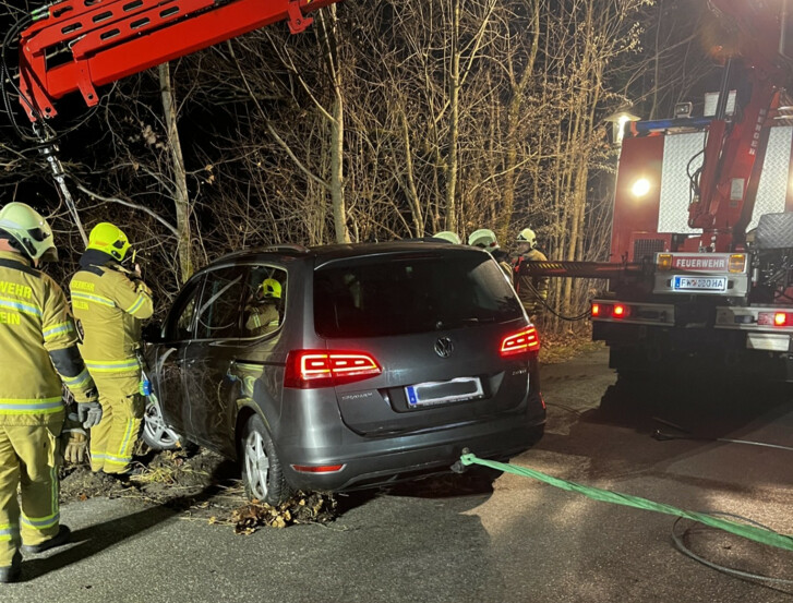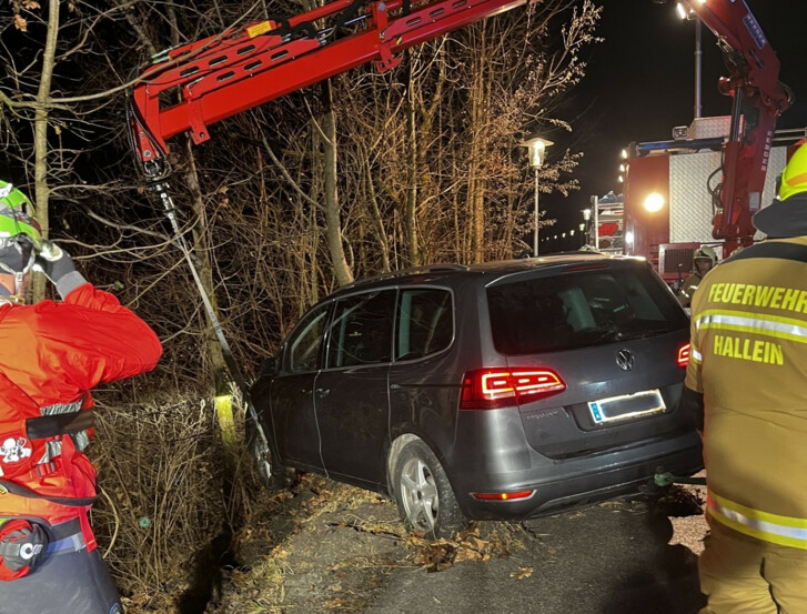 Die Bergung erfolgte mittels Kran des Rüst Hallein (SRFKA) und Seilwinde des Rüstlösch Hallein (RLFA 2000). Der PKW wurde schonend und sicher wieder auf die Straße gehoben.