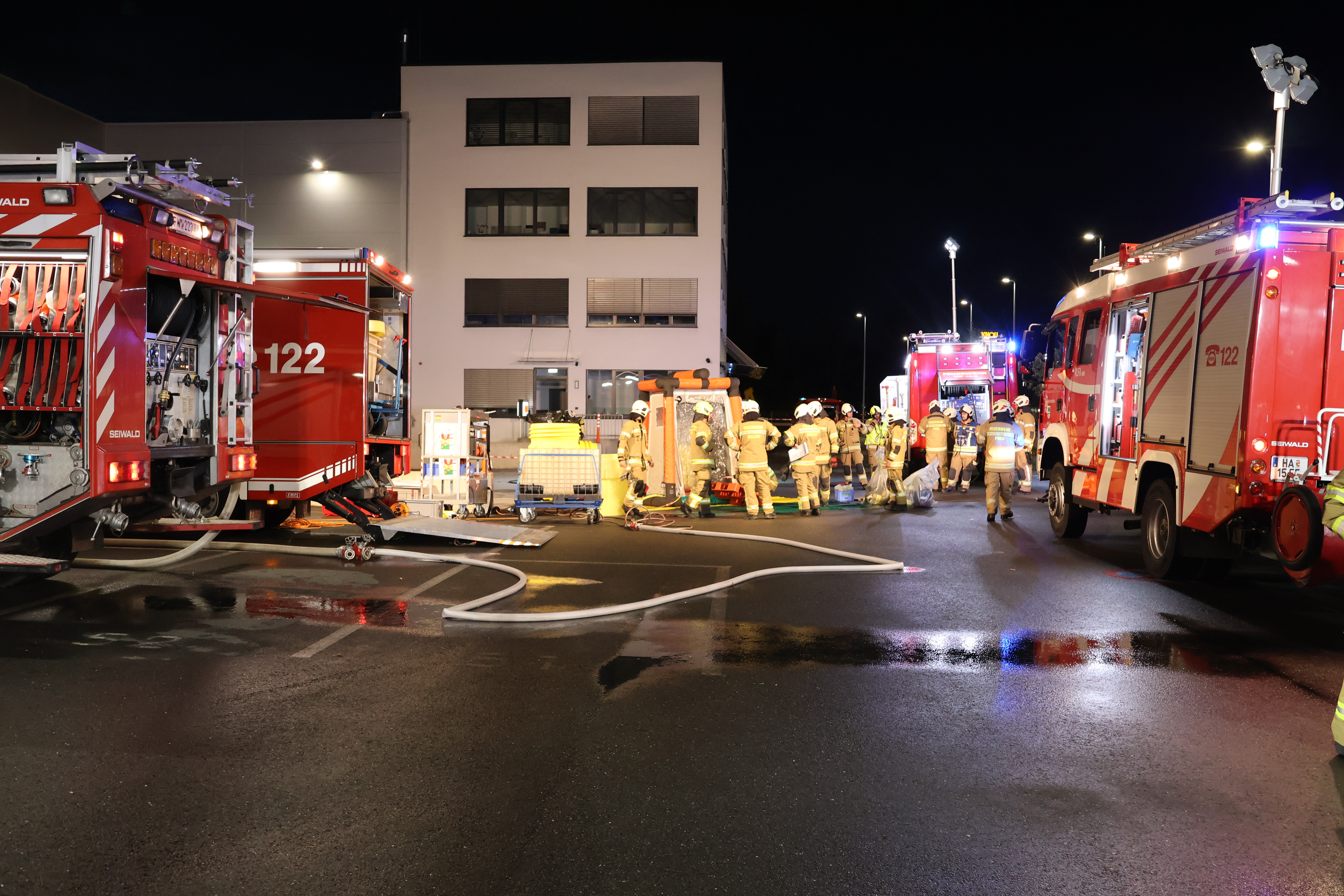 Parallel dazu wurde ein provisorischer Not-Dekontaminationsplatz eingerichtet, um eine mögliche Kontamination der Einsatzkräfte rasch behandeln zu können.
