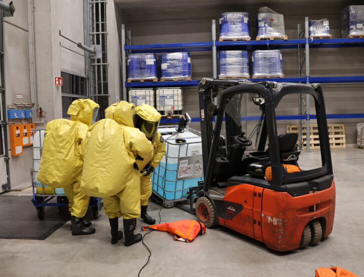 Als Ausgangslage wurde ein Unfall in einem Gewerbebetrieb simuliert: Beim Absetzen einer Palette mit einem Gabelstapler wurde ein IBC-Behälter mit einer brennbaren Flüssigkeit beschädigt. Gleichzeitig kam es zur Beschädigung einer zweiten Palette, auf der sich ein Gebinde mit einem festen Stoff – Natriumhydroxid – befand. Dadurch entstand eine gefährliche Mischung aus flüssigen und festen Stoffen mit chemischer Reaktionsgefahr.