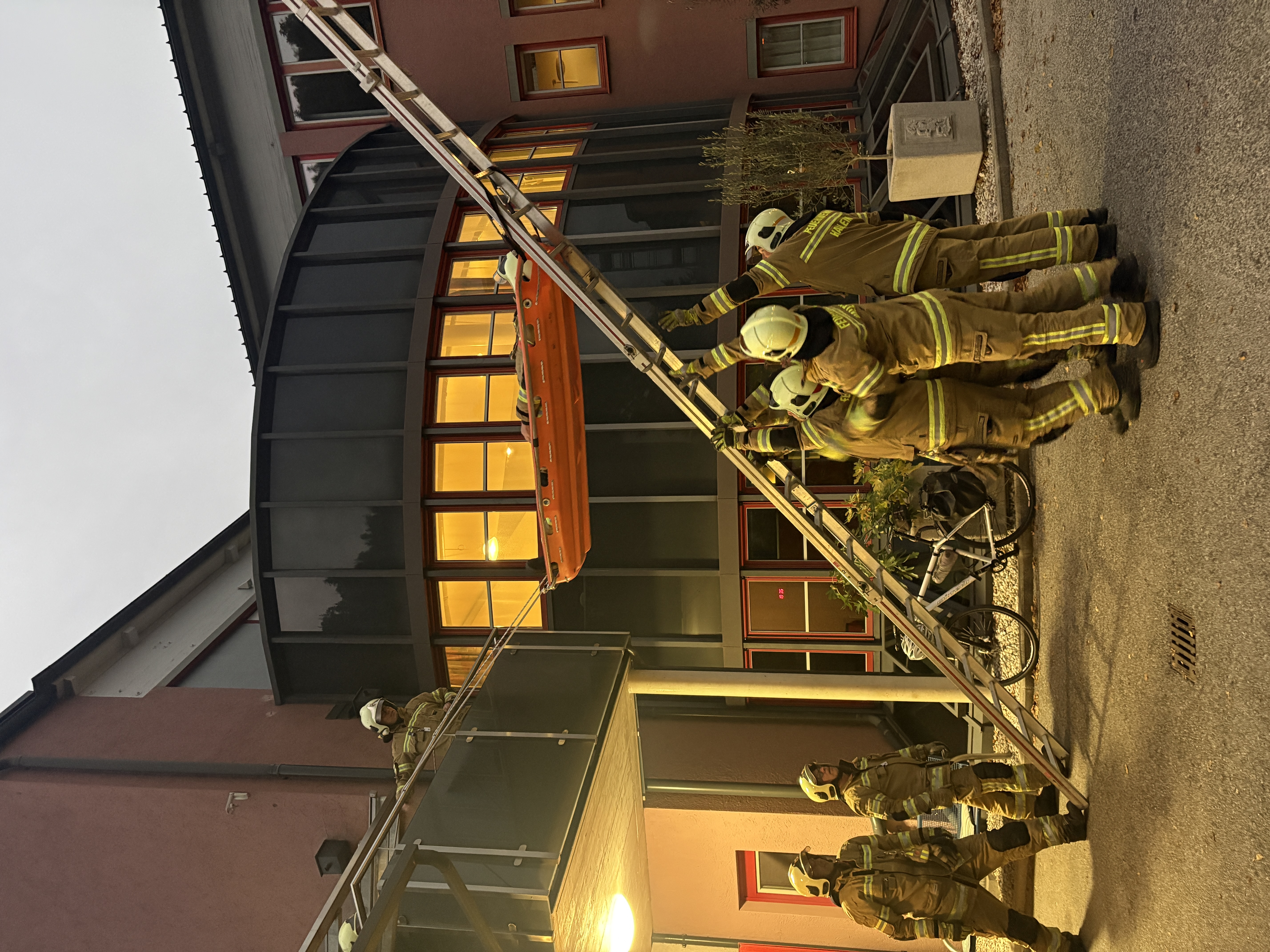 Die Feuerwehr führte über das Stiegenhaus West die Brandbekämpfung durch, setzte die Trockensteigleitung ein und rettete die im Brandraum eingeschlossenen Patienten. Parallel dazu unterstützten mehrere Trupps die Evakuierung der angrenzenden Bereiche, während die Drehleiter im Garten in Anleiterbereitschaft ging und ein möglicher Wenderohreinsatz vorbereitet wurde. Das Atemschutzfahrzeug richtete einen Atemschutz-Sammelplatz ein.
