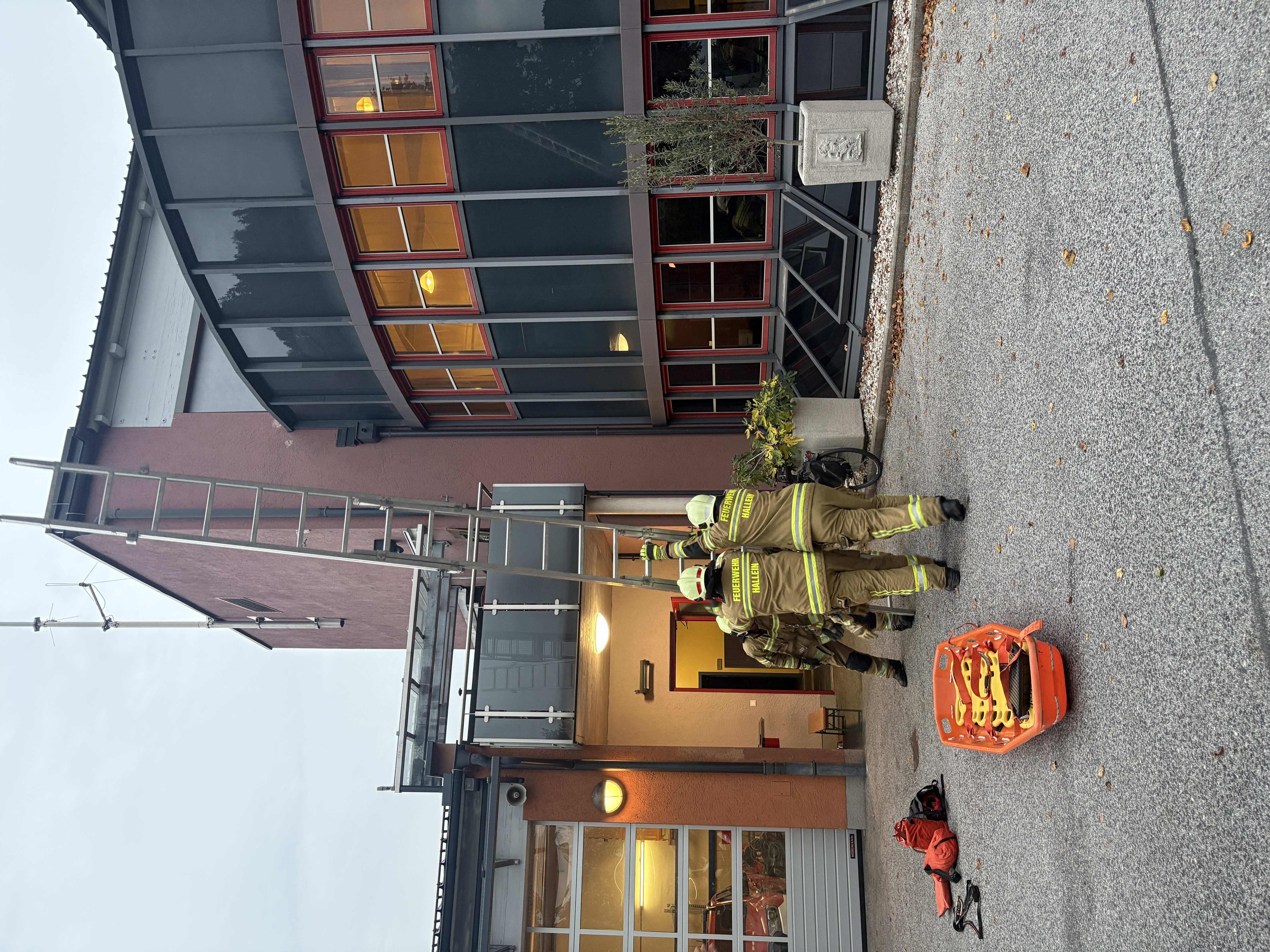 Für dieses Szenario wurde eine zweiteilige Schiebeleiter am Balkon angeleitert. Mithilfe eines Rettungsdreiecks und einer Rettungsleine konnten mehrere Personen rasch und dennoch kontrolliert gerettet werden. An der Leiter wurde mittels Bandschlinge ein stabiler Ankerpunkt eingerichtet, über den die Leine geführt und unten ein Abseilachter eingebaut wurde. Dadurch war es möglich, die Personen mit wenig Kraftaufwand und gut gebremst nach unten abzuseilen.